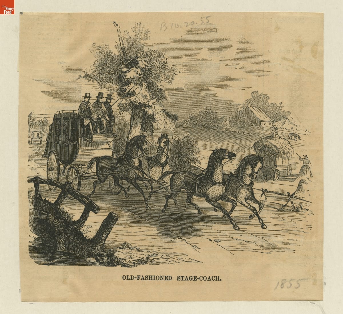 printed below image: OLD-FASHIONED STAGE-COACH handwritten at top center of image: B10.20.55 handwritten in bottom right of image: 1855 typed on paper beneath image: American coach of the Concord type. / Wood-engraving. / Date: 1855 handwritten at top right of page: #1558