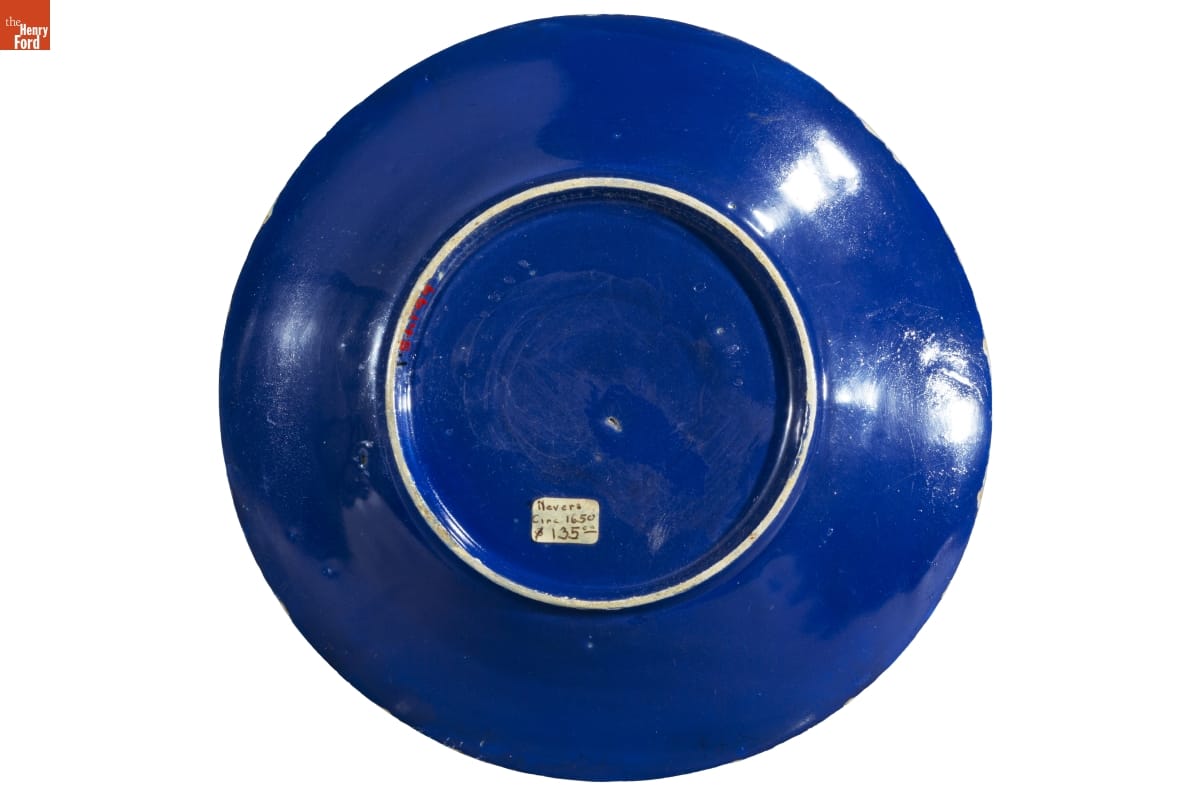 A well-to-do family in the early-18th century displayed decorated plates like this one on a table or in an open cupboard. The dishes, not used as common serving items, showed the owner's wealth and good taste. The plate's decorative motifs varied, but popular themes included: images of royalty, biblical stories, flowers, and may also have the owner's initials and a date.