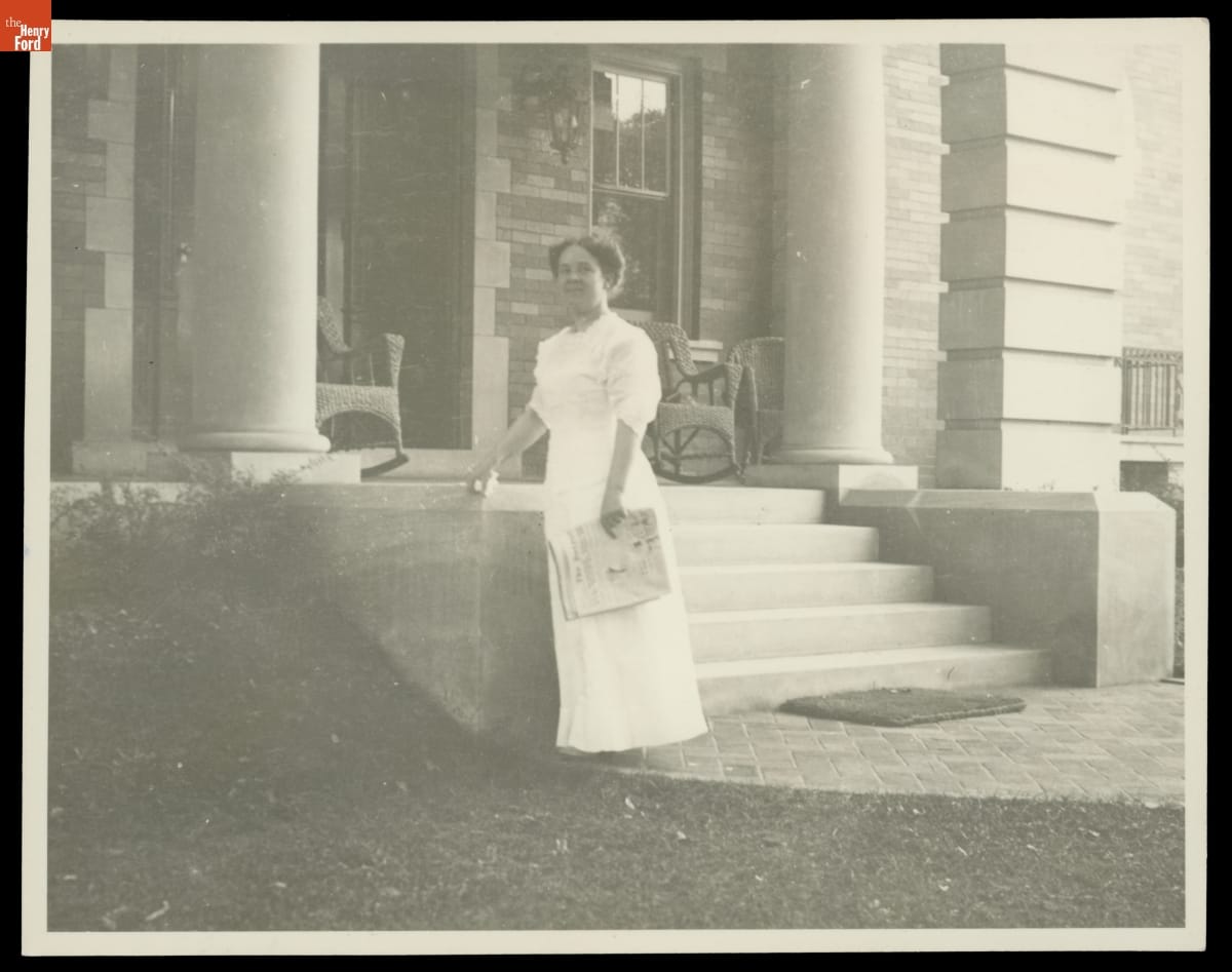 Clara Ford outside Ford Family Residence on Edison Avenue, Detroit, Michigan, circa 1910