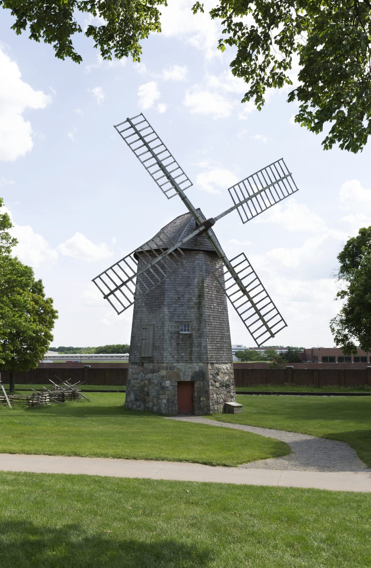 The Farris windmill is said to be the oldest windmill in the United States. It was built in the mid-1600s and operated in Cape Cod, Massachusetts. The Farris family ran it for three generations, starting in 1782. The wind moved the sails of this windmill to operate the grain milling machinery inside. The stone first floor was added at Greenfield Village.