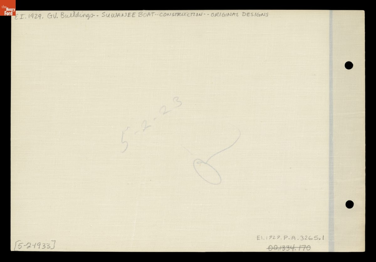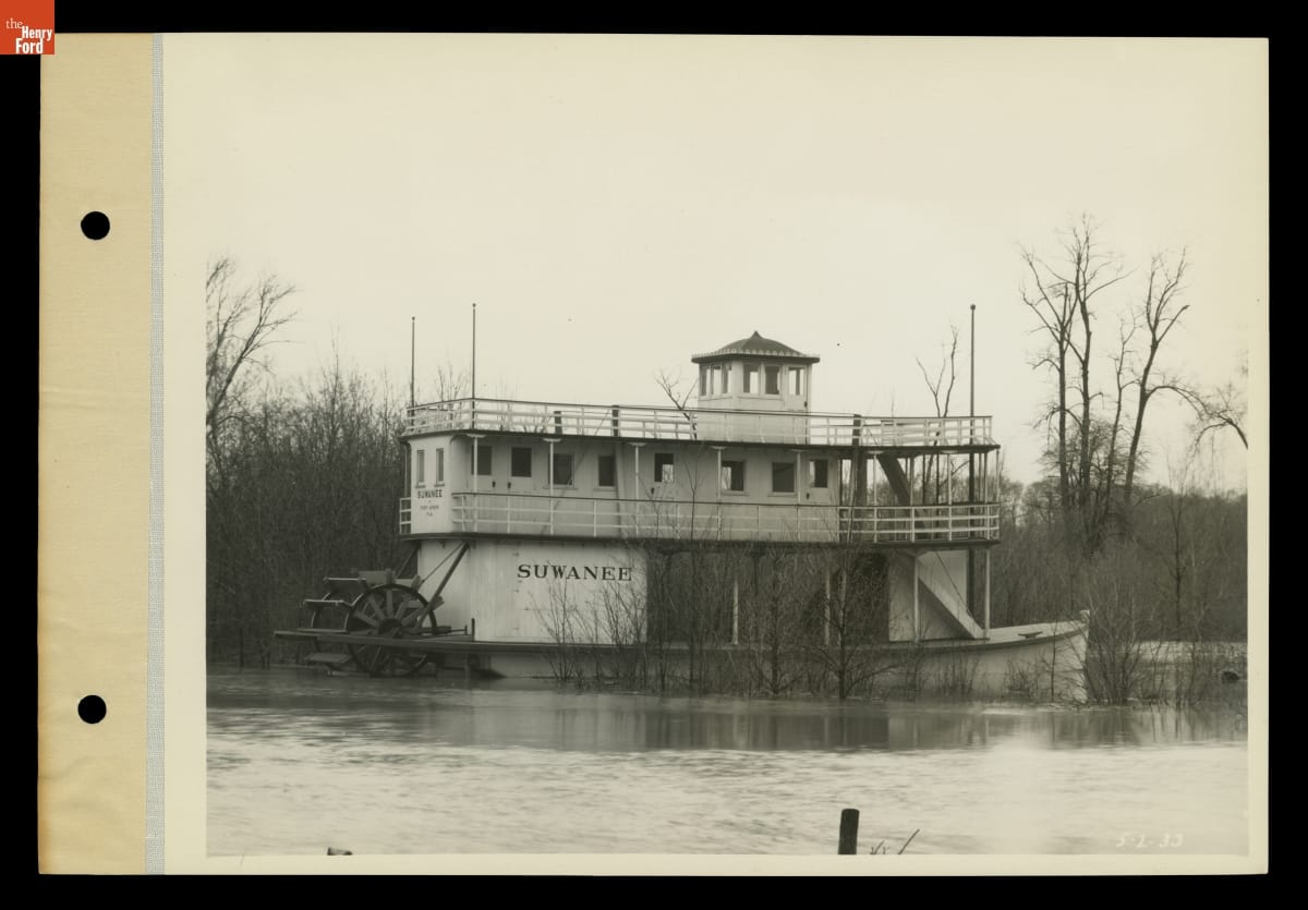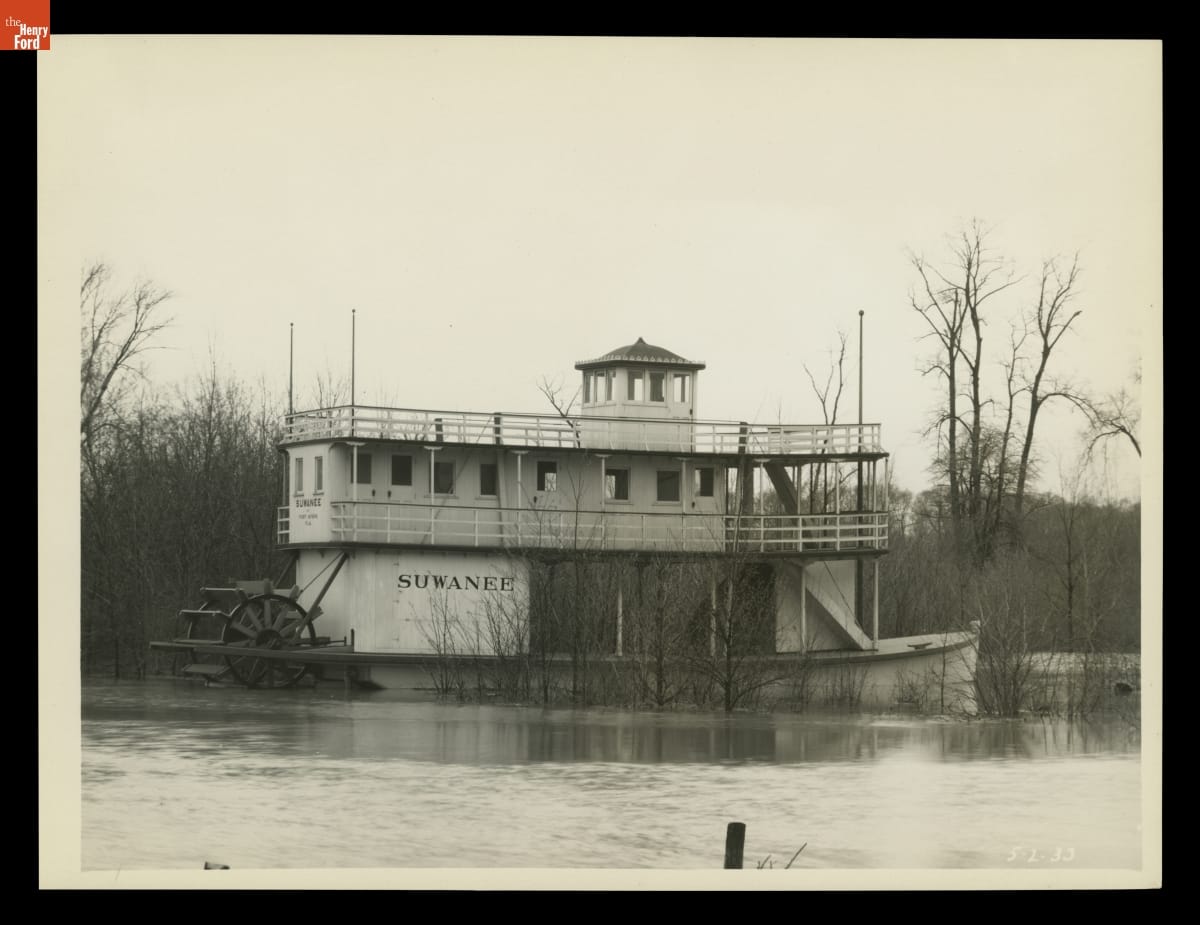 As originally built in Greenfield Village in 1929, the steamboat Suwanee had eight cabins on its middle or boiler deck. But Henry Ford wasn't happy with the vessel's ungainly appearance. He had Suwanee rebuilt as a day boat, without cabin accommodations, in 1935. Suwanee underwent two further rebuilds -- keeping to its 1935 look -- in 1969 and 1989.