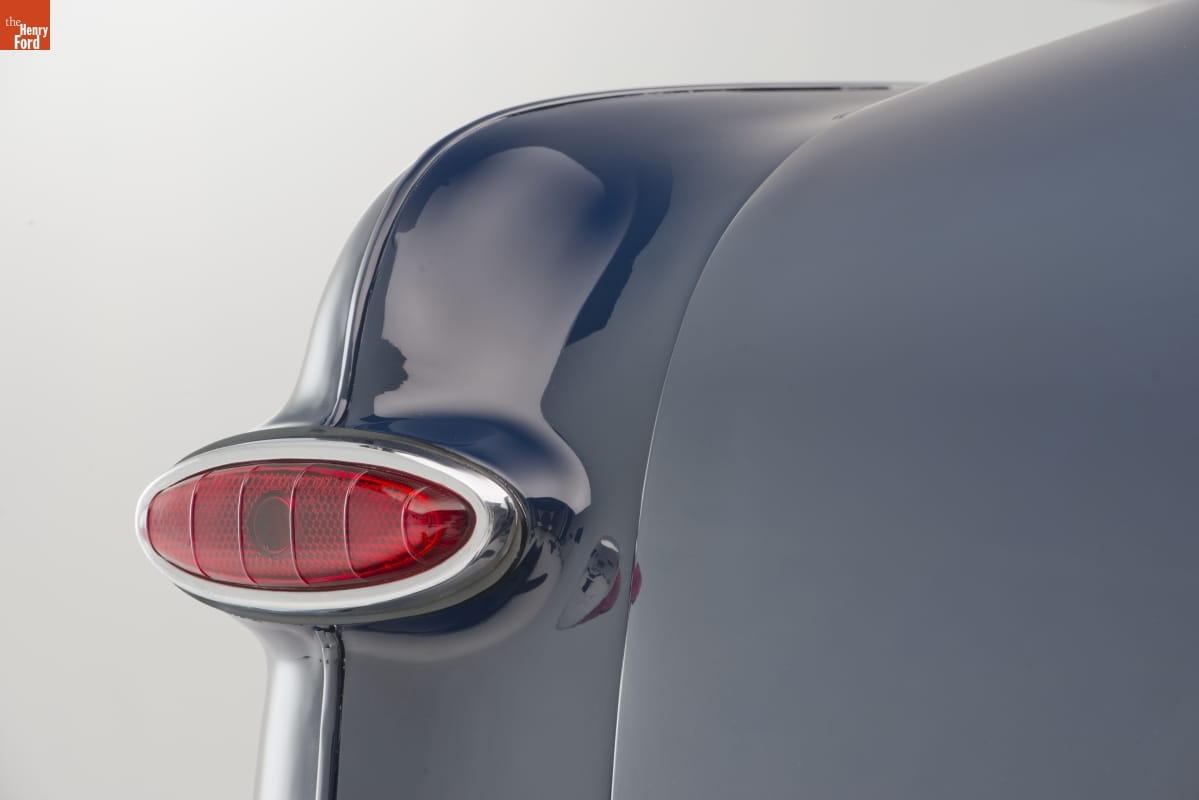 Ford's 1949 model was the company's first all-new car after World War II. The car's "envelope" body, with integral fenders and smooth slab sides, was a fresh break from previous designs. The "spinner" in the center of the grille suggested an airplane propeller, and it was an early example of the aviation themes that characterized postwar American cars.