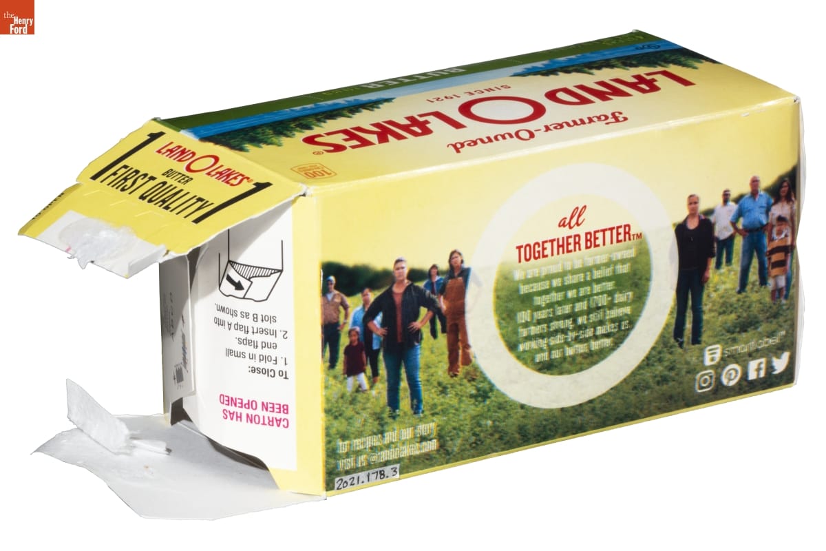 on front of packaging: 100 / CALORIES / PER TBSP / Farmer-Owned / LAND O LAKES(R) / 1700+ FARMERS / STRONG / U D / 4 STICKS / NET WT. 1 LB. (453.6g) / BUTTER SALTED on left side of packaging: 1 / LAND O LAKES(R) / BUTTER / FIRST QUALITY / 1 / MEASUREMENTS / 1 STICK = 1/2 / CUP / 1 LB. = 2 / CUPS on back of packaging: all TOGETHER BETTER TM / We are proud to be farmer-owned / because we share a belief that / together we are better. / 100 years later and 1700+ dairy / farmers strong, we still believe / working side-by-side makes us, / and our butter, better. / smartlabel TM / for recipes and our story / visit us @landolakes.com on right side of packaging: 1 / LAND O LAKES(R) / BUTTER / FIRST QUALITY / 1 / USDA / U.S. / GRADE / AA / WHEN / GRADED / PACKED UNDER INSPECTION OF / THE U.S. DEPT. OF AGRICULTURE / OFFICIALLY GRADED / BEST If Used By / Date on Packaging / MAY BE KEPT UP TO / 4 MONTHS IF FROZEN / COMMENTS? 1-800-328-4155 on top of packaging: 100 / CALORIES / PER TBSP / Farmer-Owned / LAND O LAKES(R) / SINCE 1921 / U D / 4 STICKS / NET WT. 1 LB. (453.6g) / BUTTER SALTED on bottom of packaging: Nutrition / Facts / [...] / (C) 2019 Land O'Lakes, Inc. / [...] / MANUFACTURED BY LAND O'LAKES, INC., ARDEN HILLS, MN 55126
