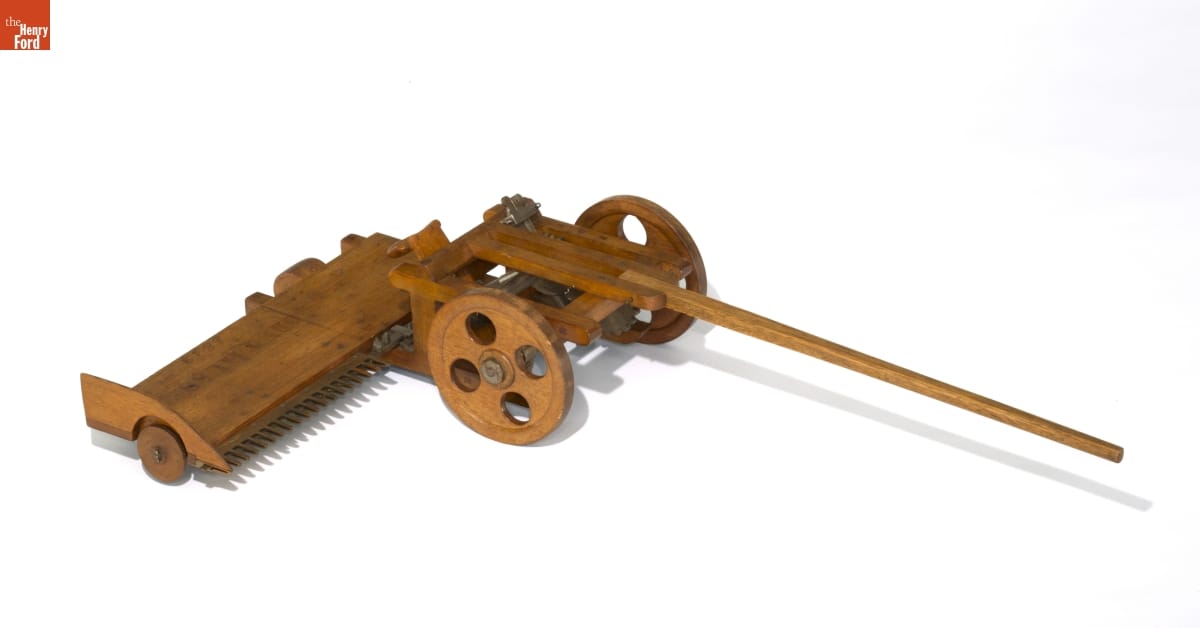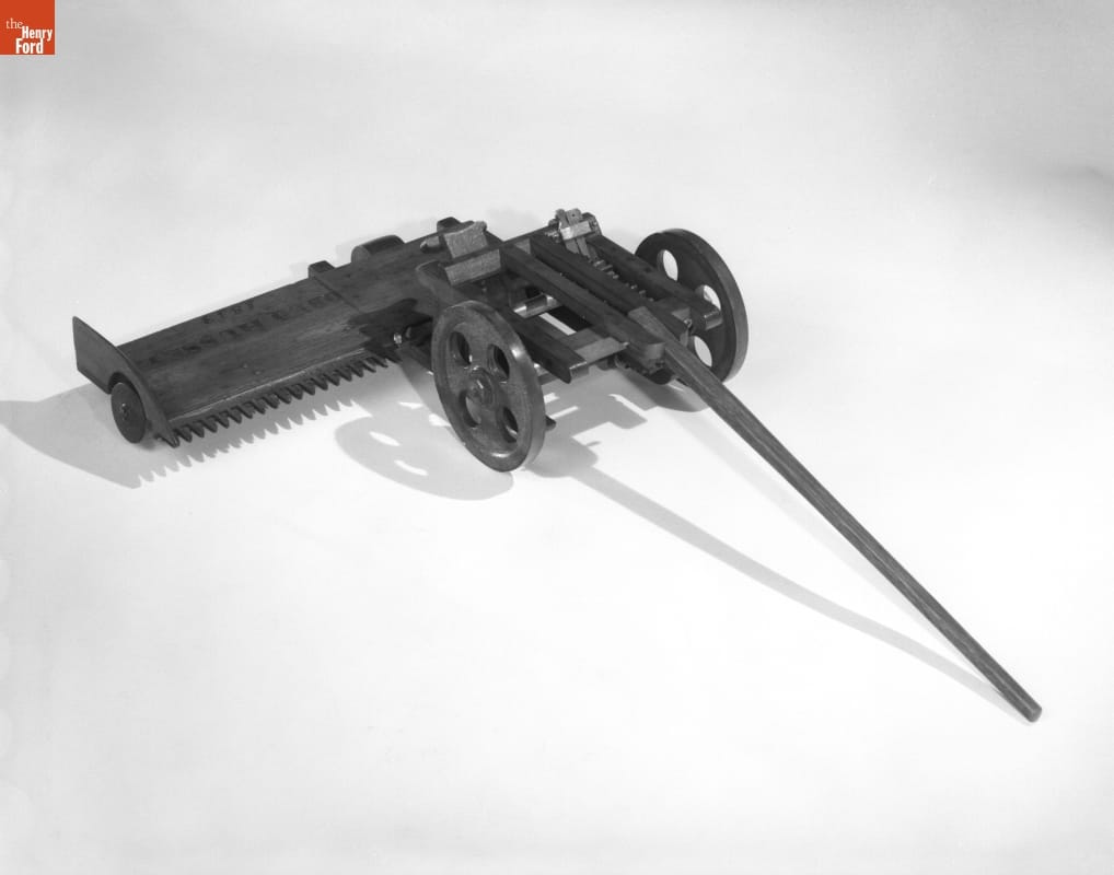 Obed Hussey and Cyrus McCormick were rival for the honor of developing the first successful grain harvester. Hussey patented a reaper in 1833 (McCormick's patent was 1834) and had sold about 500 machines by 1850. This model, based on the 1833 patent drawings, was made about 1860, probably for patent litigation court cases against McCormick.