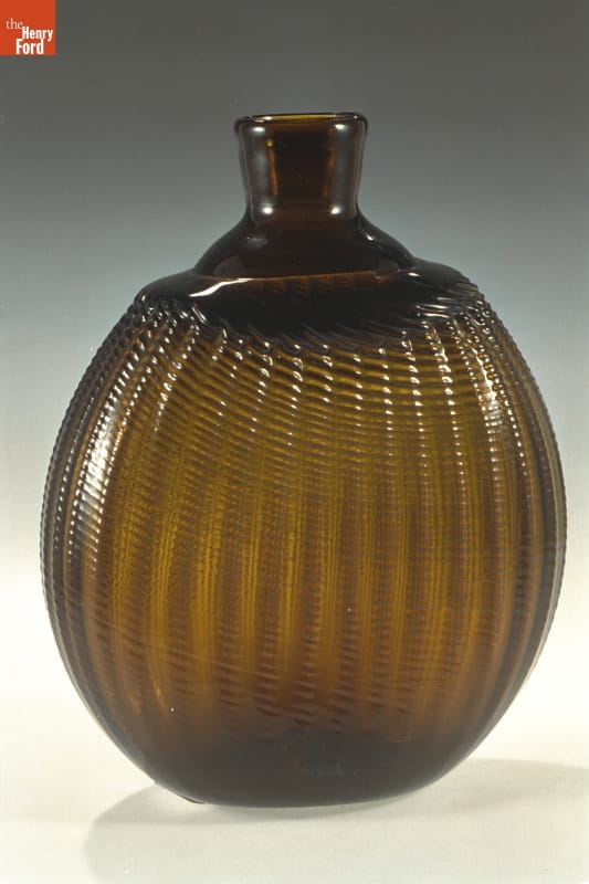 American glass factories produced flasks, like this one, from the late 1700s well into the mid-1800s. The pint-sized flask could hold water but more likely contained alcoholic beverages. Its textured decorative exterior -- formed when the hot glass was dipped into a pattern mold before it was blown -- made the flask easier to grasp. And its flattened shape fit nicely into pockets providing ready access to the liquid refreshment.