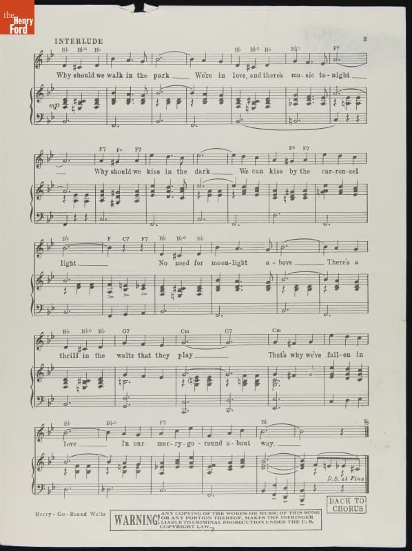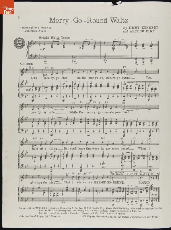 Guy Lombardo and His Royal Canadians gained international success through their prolific recordings produced between 1927 and 1952. Lombardo, a Canadian-American of Italian descent, was one of several bandleaders whose dance bands performed this waltz. By the time it was released in 1949, merry-go-rounds were a nostalgic throwback to an earlier time when adults--rather than children--enjoyed riding them.