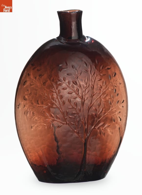 Glass factories in America began producing inexpensive, mold-formed flasks in the early 1800s. These figured flasks, often decorated with symbols of national pride or political or cultural affiliation, appealed to America's common man. Other images, like the tree, may have been purely decorative. Variation of this design include a tree in bloom (summer) and a tree without leaves (winter).