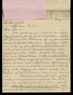 This flag was handmade by Lucinda McGrath of Fayette County, Indiana. Her husband, John, carried it in parades supporting Republican candidates Abraham Lincoln and Hannibal Hamlin in the 1860 presidential election. In 1865, McGrath--carrying this flag--led a group of mourners to meet Lincoln's funeral train as it passed through Indiana en route to its final stop in Springfield, Illinois.