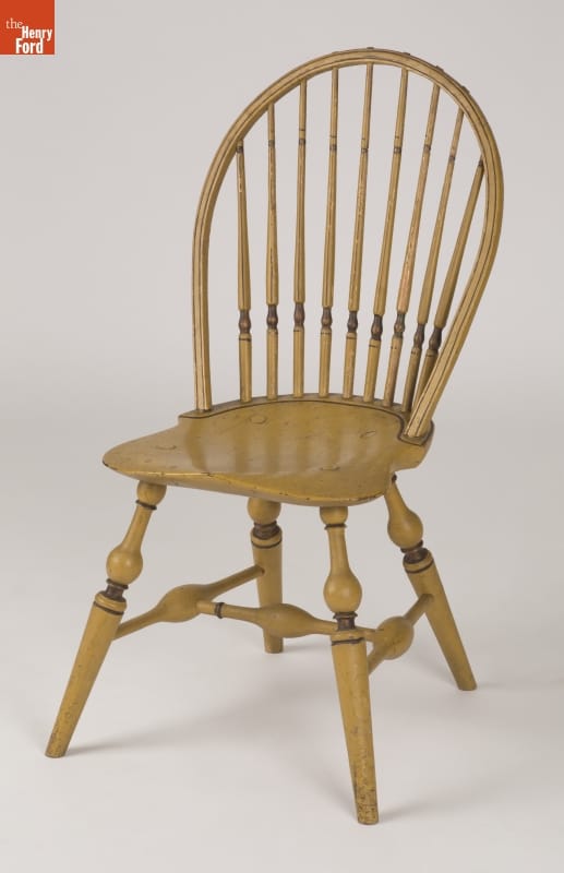 Windsor chairs began to appear in American homes in the mid-18th century, and they are still being made today. When first introduced, they were used in every room of the house -- but especially in public spaces because they were so sturdy and inexpensive. This "bow back" chair -- named for the steam-bent back rail -- was one of the earliest Windsor forms seen in America.
