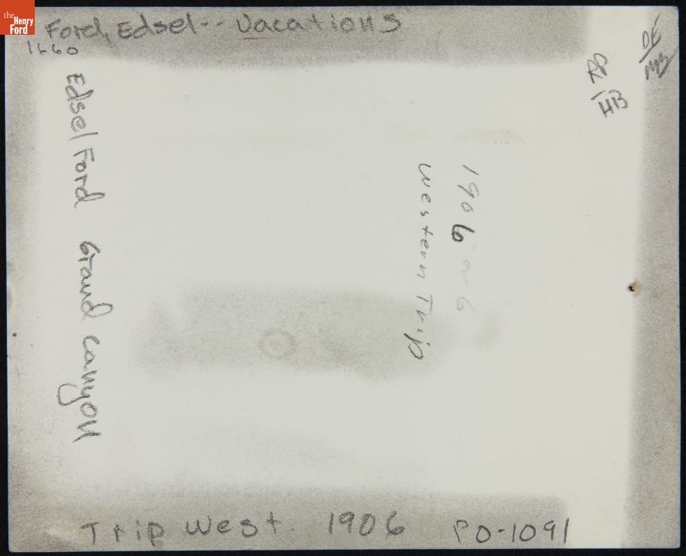 A 1906 trip took the Ford family, along with Clara Ford's mother, to Southern California where they visited Clara's sister in Altadena. During a stop along the way, a young Edsel got his first view of the Grand Canyon. Edsel visited the canyon at least three more times in his life, returning with family, friends and on his honeymoon.