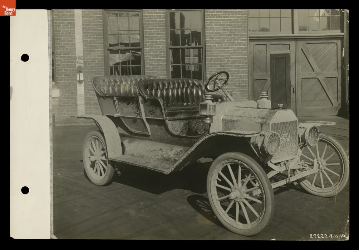 This mud-spattered Model T prototype, parked outside Ford Motor Company's Piquette Avenue factory in Detroit, completed a 1,357-mile test drive in September 1908. The drive proved the soundness of Henry Ford's latest design. The new car went on sale October 1.