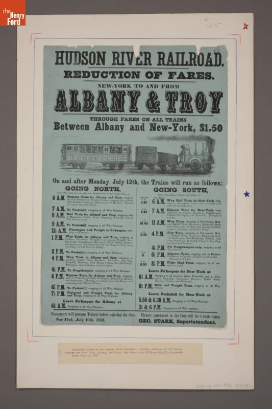 As the 19th century progressed, Americans had additional travel options. Railroads competed with steamboats for freight, mail, and passenger traffic. Rail routes often paralleled major river traffic routes. In 1852, the Hudson River Railroad offered travel to points along the river between New York City and Troy. This schedule shows the different travel schedules and options available to passengers.