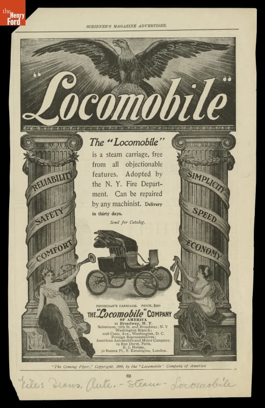 Printed from top of ad down: "Locomobile" / The "Locomobile" / is a Steam Carriage, Free / from all Objectionable / Features. Adopted by / the N.Y. Fire Depart- / ment. Can be repaired / by any machinist. Delivery / in 30 days. Delivery / in thirty days. / Send for catalog.