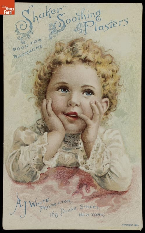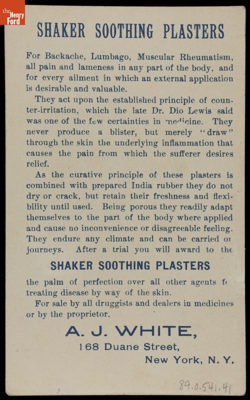 Trade Card for Shaker Soothing Plasters, A. J. White, 1891