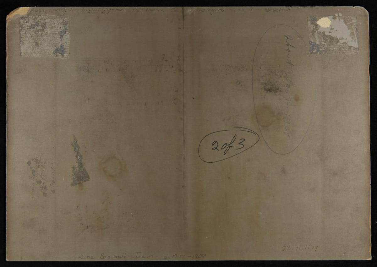 written on front [nine names of players written in cursive]: D or O. E. Smith [?], [?] Braun [?], [?.?] McLean, W. H. Newton, A. [?] Malcolmson[?] / J.H. Rohan, Fred L. Troth[?], H. H. Mc[?]uiston, R. A. Logan. written on back: About 1907-1908