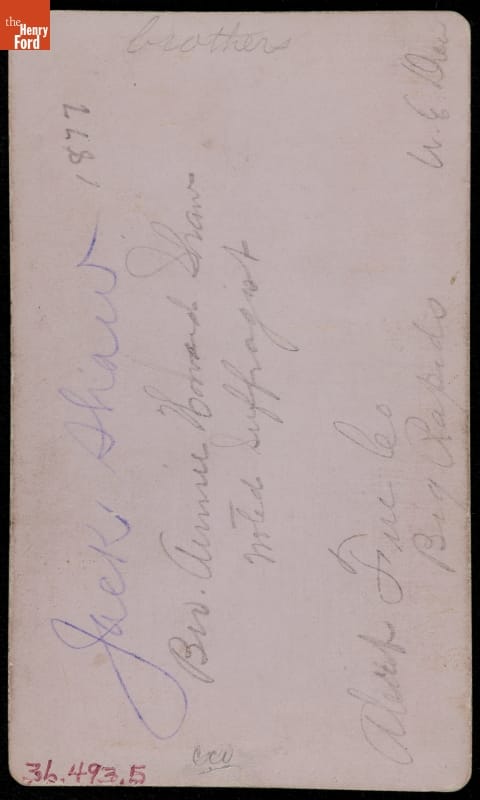 Handwritten in pencil on back of image: Jack Shaw / 1877 / Bro. Anna Howard Shaw / noted suffragist / Alert Fire Co / Big Rapids / W.E. Drew