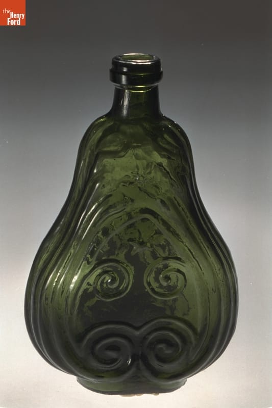 Glass factories in America began producing inexpensive, mold-formed flasks in the early 1800s. These figured flasks appealed to America's common man. Many of these flasks contained symbols of national pride or political or cultural affiliation. Embellishments on other flasks, like this one, were purely decorative.