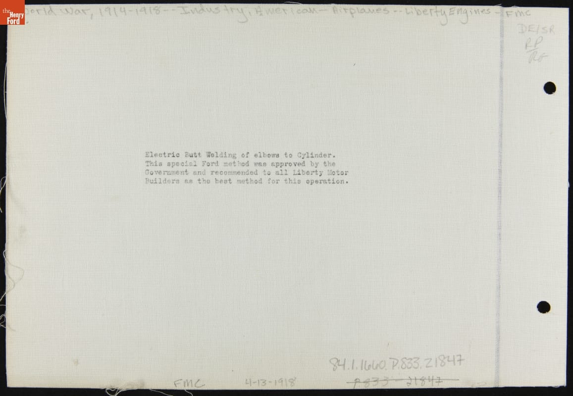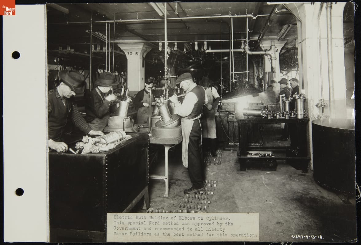 Ford Motor Company Workers Welding Elbows to Cylinders for Liberty Aircraft Engines, April 1918