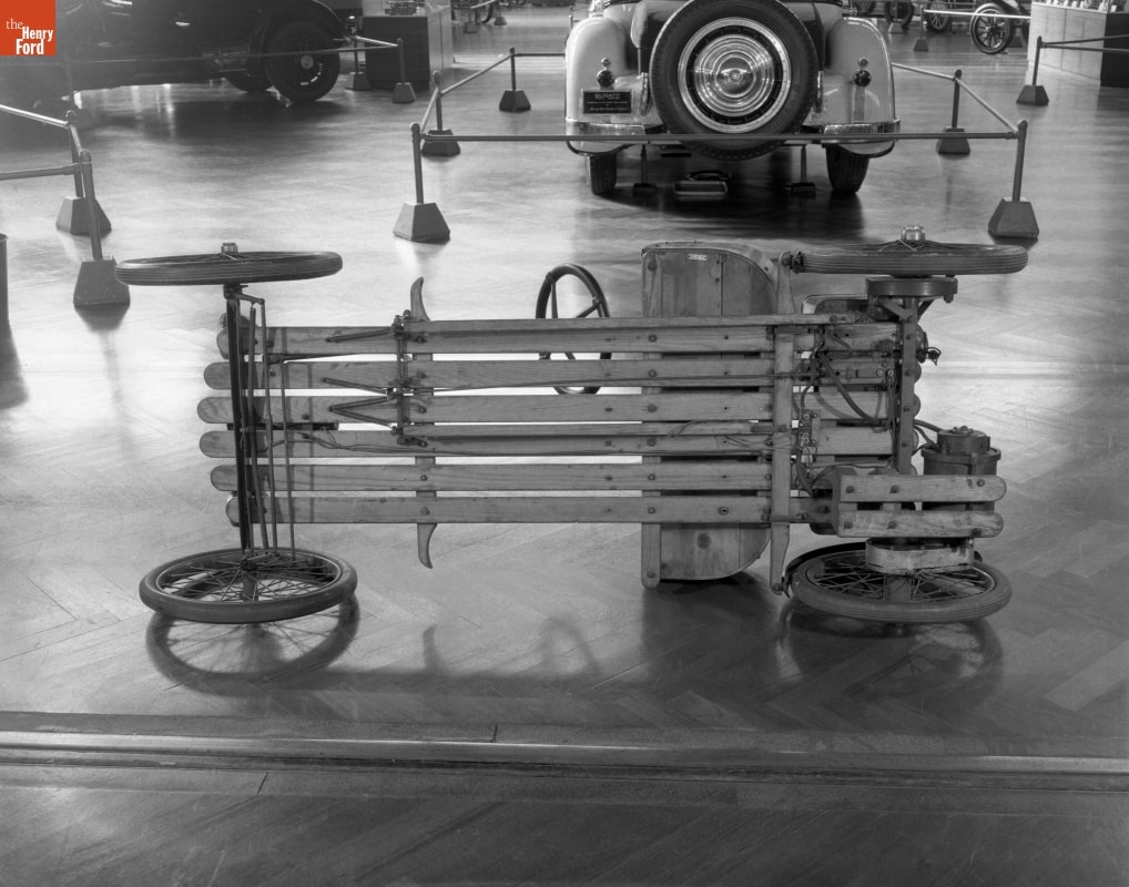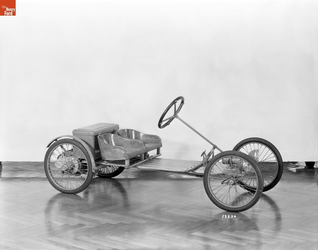 This electrically powered Red Bug runabout was used by Edsel and Eleanor Ford's children: Henry, Benson, Josephine, and William. The motor at the rear was fed by two six-volt batteries stored in the box behind the seats. Top speed was about 10 miles per hour, and range was between 20 and 30 miles on a single charge.