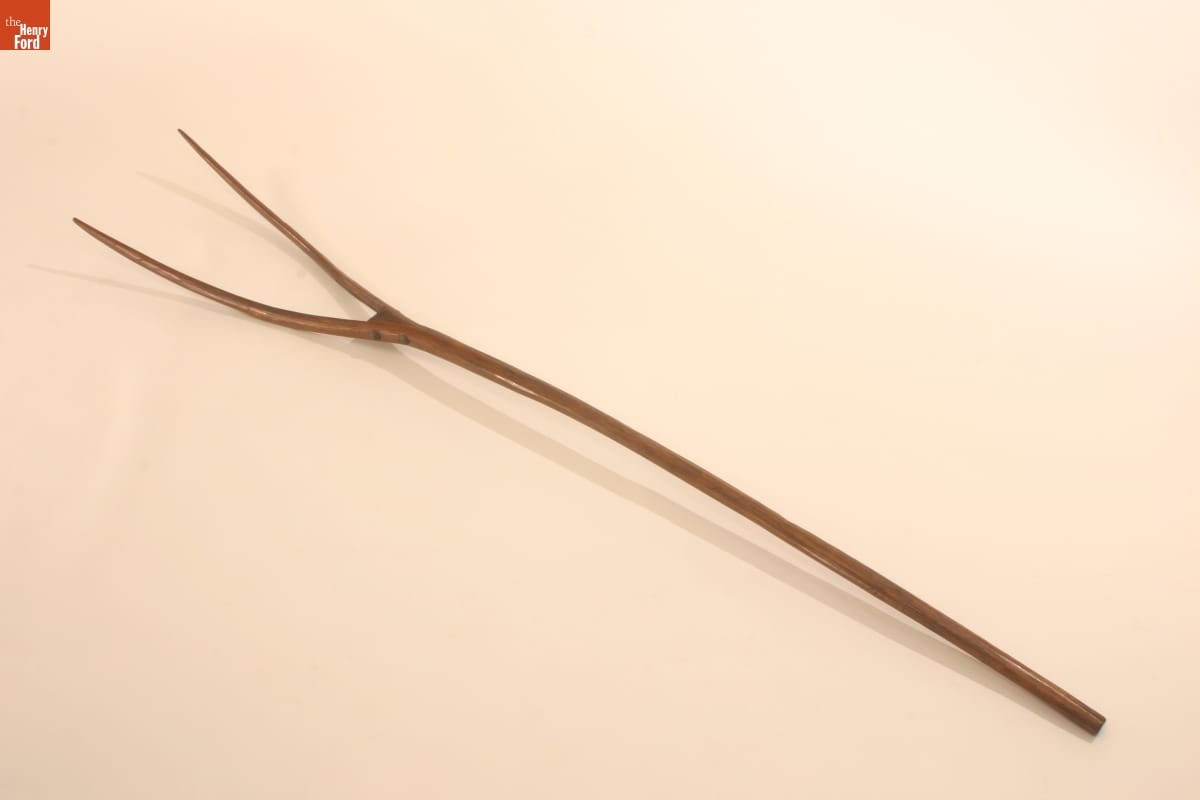 Forks worked as extensions of farmers' arms, allowing them to skewer, lift, and move larger quantities of grain, straw or hay than they could do with just their hands. This fork started as a square wooden piece of ash or hickory. Riving (or separating) one end and bending the tines (or points) created two- and three-tine forks that farmers used to move bundles of grain or hay cut from stacks.