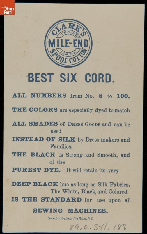 Products manufactured by Clark's O.N.T., Newark, New Jersey. Card printed by Donaldson Brothers, Five Points, New York.