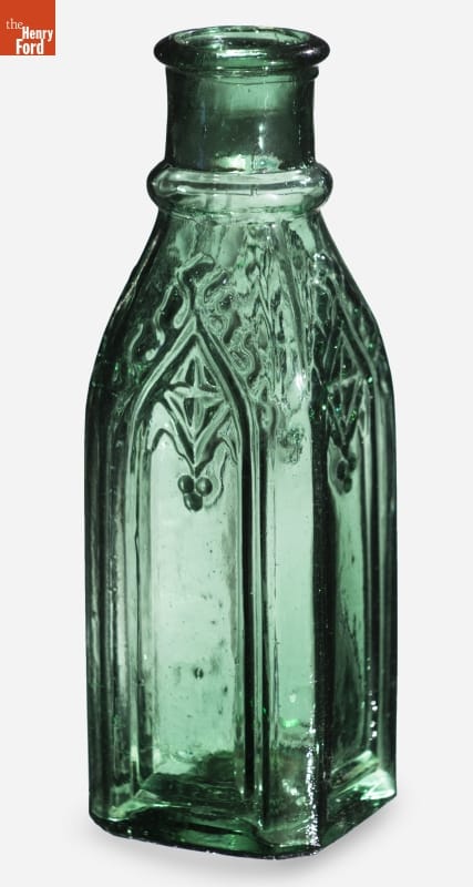 Americans in the mid-to-late 19th century purchased a variety of pickled and preserved foods in inexpensive, commercially made glass containers. Though cheap, some of these utilitarian bottles were distinctive in their decorations. This gothic-inspired bottle with its pointed arches and trefoils appealed to the tastes of many 19th-century middle class Americans and was found sitting on pantry and cupboard shelves, or atop kitchen tables.