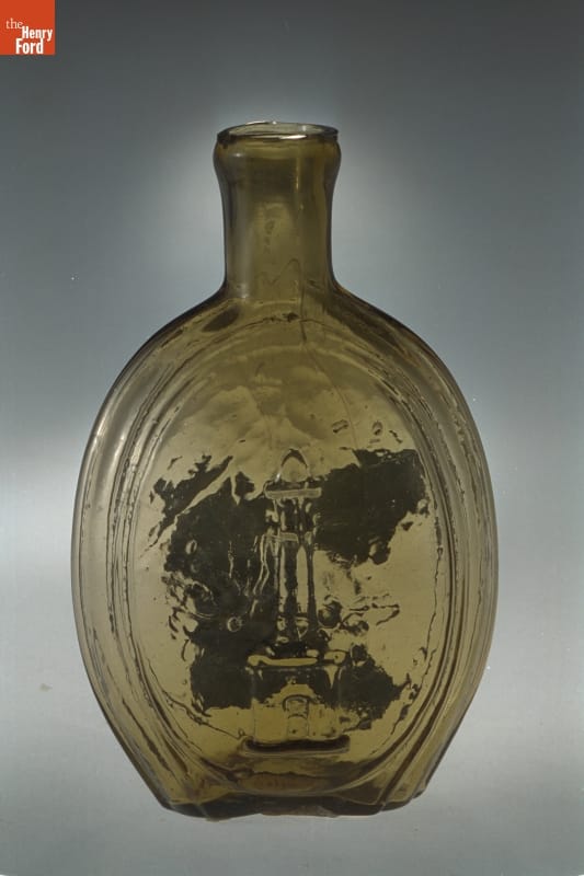 Glass factories in America began producing inexpensive, mold-formed flasks in the early 1800s. These figured flasks, often decorated with symbols of national or civic pride, appealed to America's common man. Citizens of Baltimore, Maryland, would have recognized the image of the city's Washington Monument on this locally made flask. And the sloop would have been a familiar sight to those living in this port city.