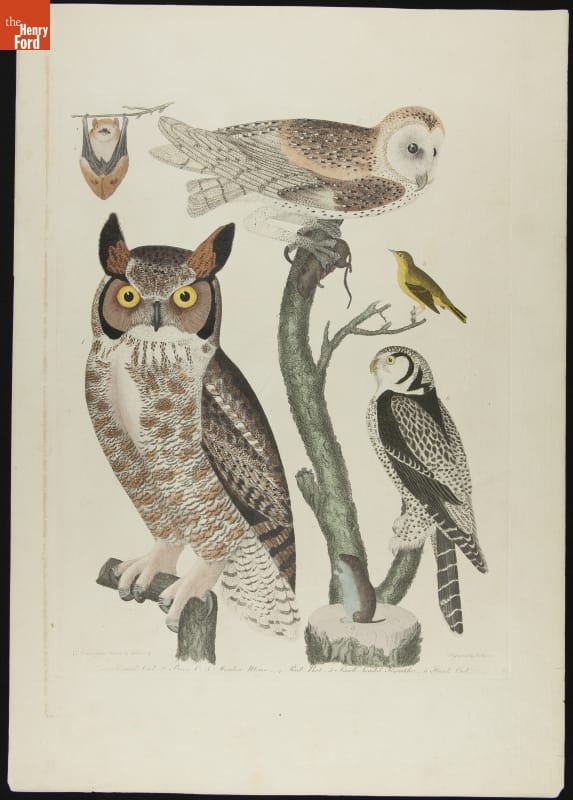 Engraving, "Great Horned Owl, Barn Owl, Meadow Mouse, Red Bat, Small-headed Flycatcher, and Hawk Owl," 1808-1825