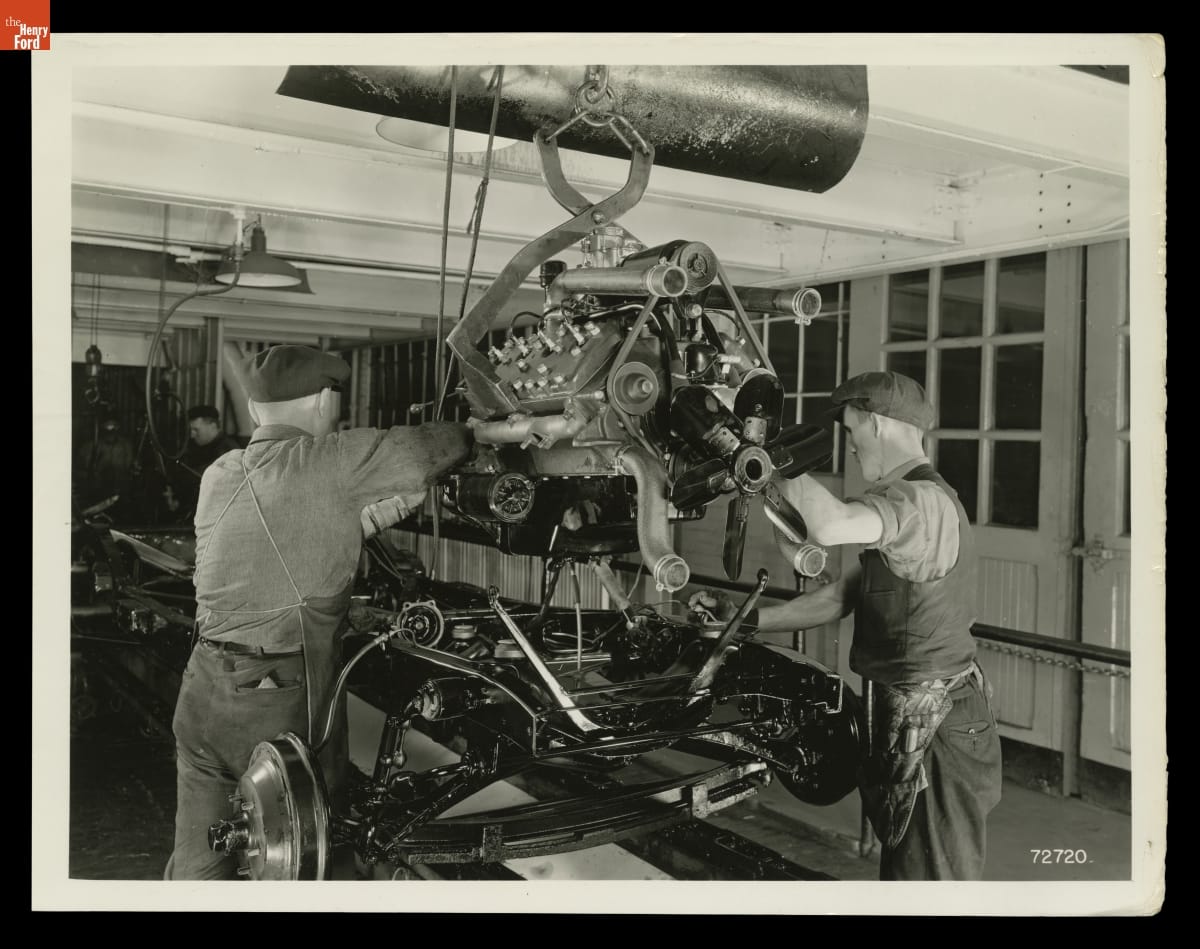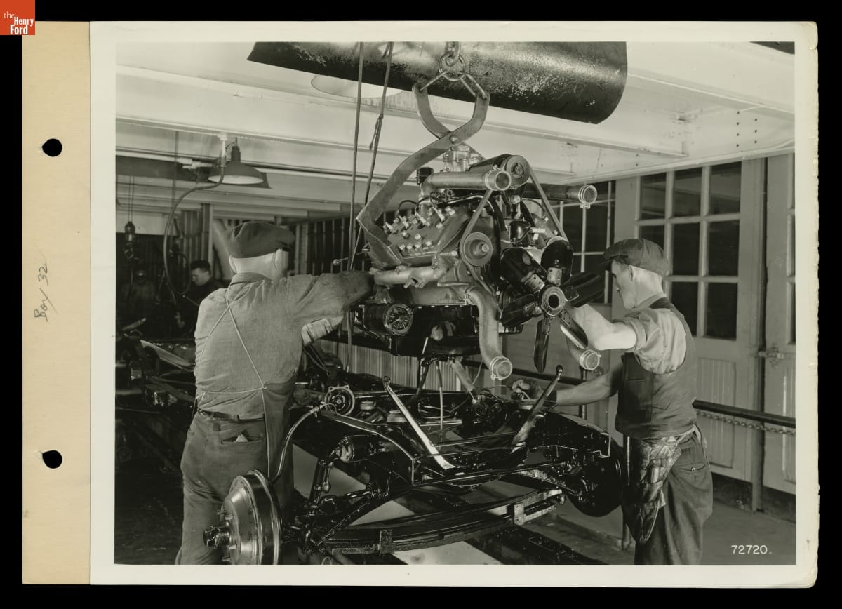 Engineers at Ford's Highland Park plant had fine-tuned the moving assembly line. With this experience in hand, Ford created the "B" Building at its new River Rouge complex with extensive conveyer systems to accommodate the flow of parts and assembly processes. Here, line workers lower one of Ford's innovative V-8 engines with attached transmission into a steadily moving chassis.