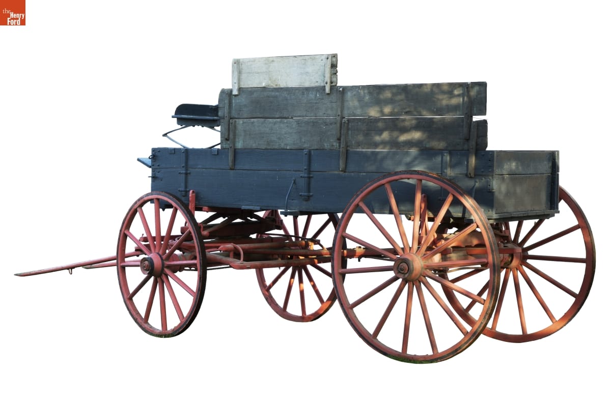 The general-purpose farm wagon was one of the most important horse-drawn vehicles in rural America. While most came with square bodies, their sizes varied for use with from one to four horses. This wagon's seat and upper side boards were removeable to accommodate different loads. With the body removed, the running gear could be used to haul logs or lumber.