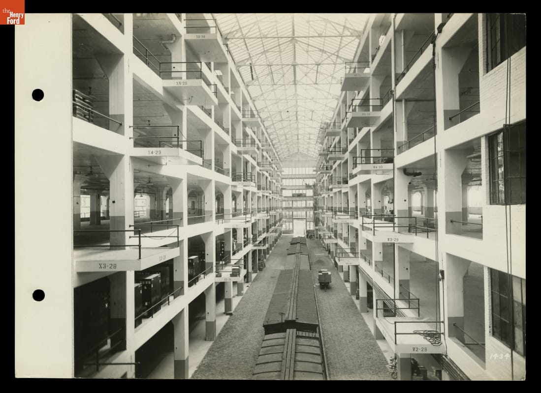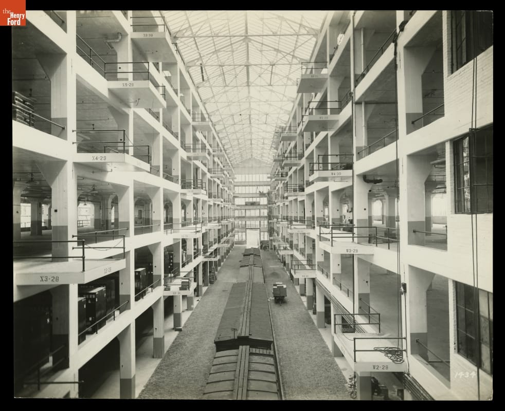 Ford Motor Company opened its Highland Park plant in 1910, where it built most of its Model Ts, developed its moving assembly line, and instituted its Five Dollar Day. In 1914, Ford opened two new six-story buildings connected by a glass-covered craneway. Supplies delivered by railroad could be unloaded by crane and lifted to any floor of either building.
