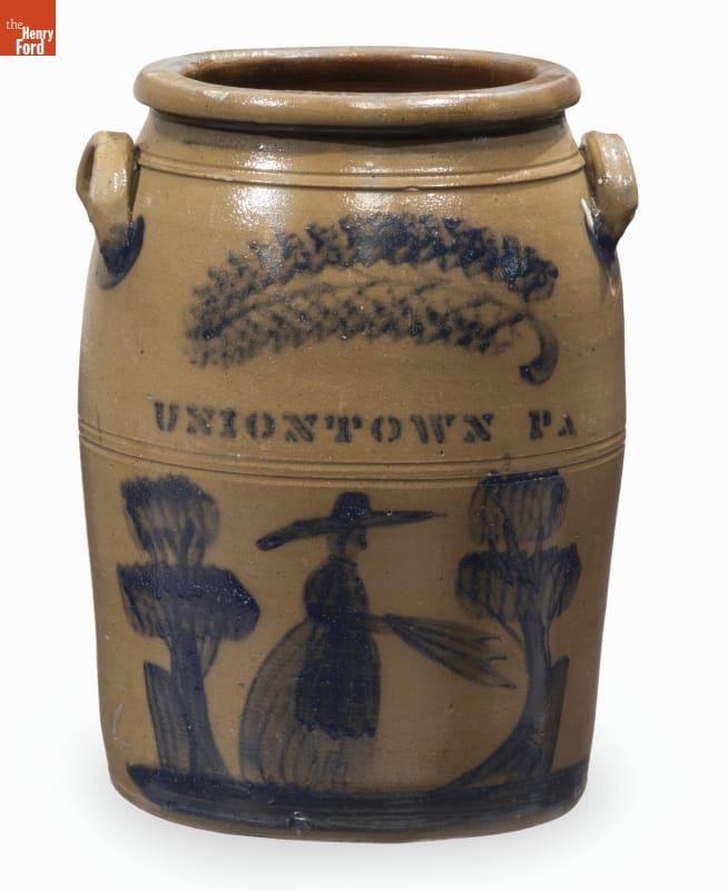 This crock was made of a durable, leak-proof pottery called stoneware, shaped on a potter's wheel. The orange-peel-like outer glaze was created when the potter threw handfuls of common rock salt into a white-hot kiln during the piece's firing. Salt-glazed stoneware pieces were decorated with an amazing array of designs, including the human figure and trees on this piece.