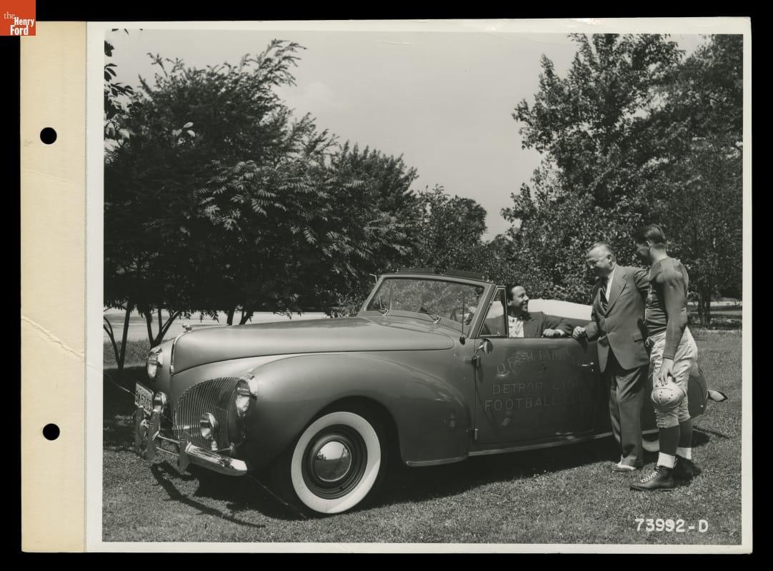Football fans could thank Dearborn, Michigan, Ford dealers for presenting radio broadcasts of the 1940 Detroit Lions' season. Fans could tune into WJR each week to hear the play-by-play. In addition, dealers sponsored an August preseason show that featured news from the Lions' training camp and interviews with players. Photographs, like this one, helped promote local dealers and the Lions' games.