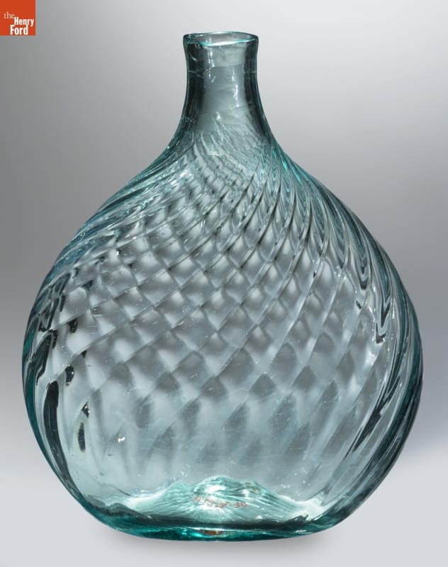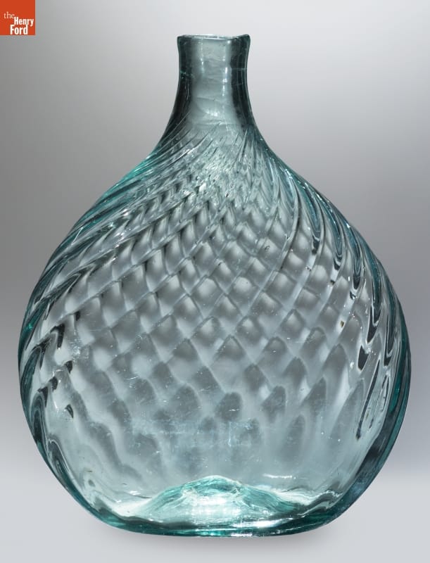 American glass factories produced flasks, like this one, from the late 1700s well into the mid-1800s. The pint-sized flask could hold water but more likely contained alcoholic beverages. Its textured decorative exterior -- formed when the hot glass was dipped into a pattern mold before it was blown -- made the flask easier to grasp. And its flattened shape fit nicely into pockets providing ready access to the liquid refreshment.
