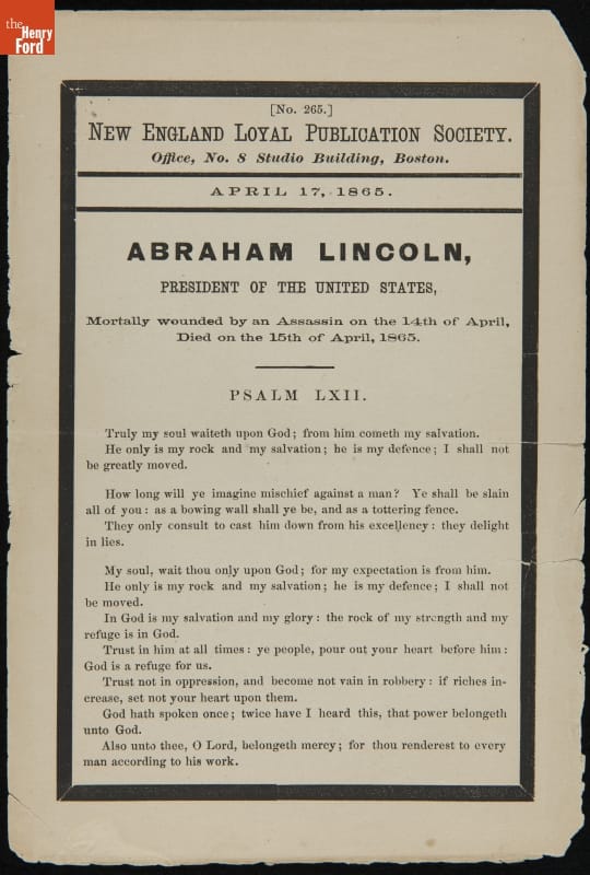 On front: [No. 265.]/ NEW ENGLAND LOYAL PUBLICATION SOCIETY./ Office, No. 8 Studio Building, Boston./ April 17, 1865./ ABRAHAM LINCOLN,/ PRESIDENT OF THE UNITED STATES,/ Mortally wounded by an Assassin on the 14th of April,/ Died on the 15th of April, 1865./ PSALM LXII./ Truly my soul waiteth upon God;...