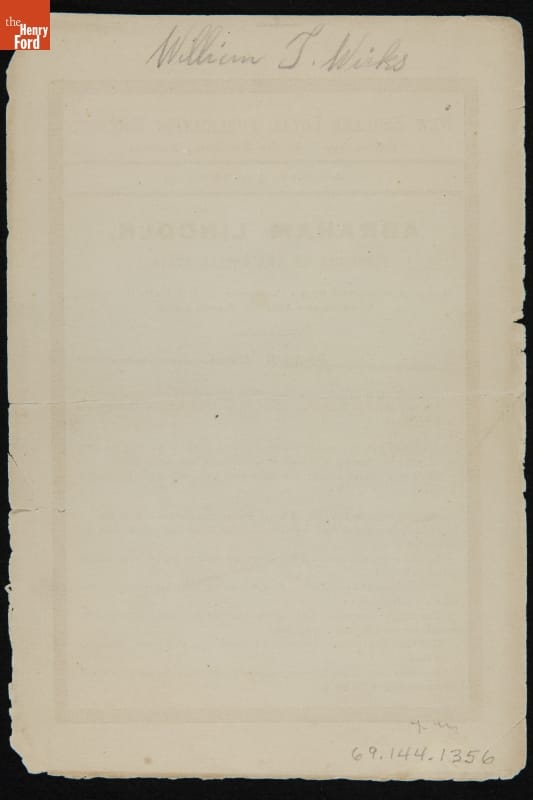 This broadside is a tribute to Abraham Lincoln, dated April 17, 1865, several days after his assassination. The New England Loyal Publication Society, formed in 1863 to distribute pro-Union publications, featured Psalm LXII from the Bible. Memorials like this helped the many American citizens who felt a strong bond with the martyred President. Many people collected mementos like this as a way of expressing their grief.
