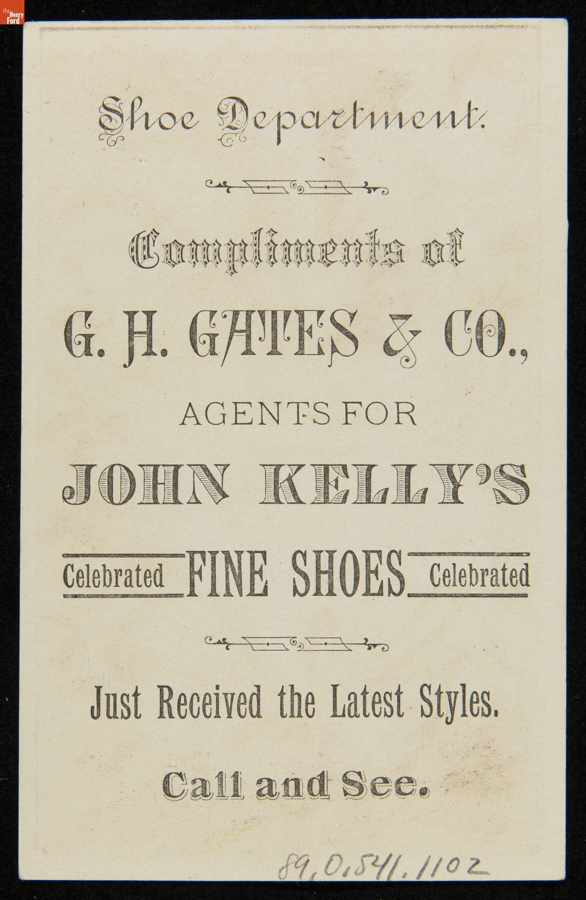 As color printing gained momentum in the late 19th century, trade cards became a major means of advertising goods and services. Americans enjoyed and often saved the little advertisements found in product packages or distributed by local merchants. This trade card is for John Kelly's Fine Shoes.
