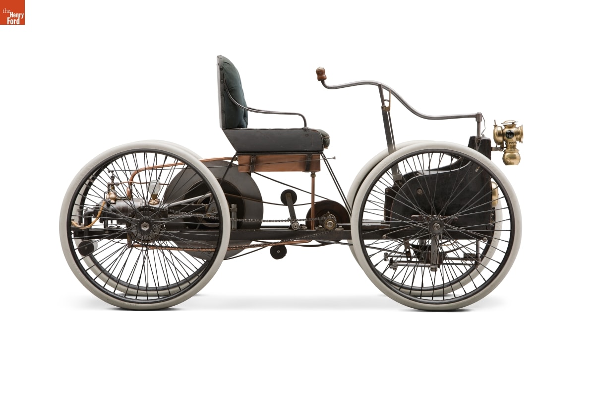 The Quadricycle was Henry Ford's first attempt to build a gasoline-powered automobile. It utilized commonly available materials: angle iron for the frame, a leather belt and chain drive for the transmission, and a buggy seat. Ford had to devise his own ignition system. He sold his Quadricycle for $200, then used the money to build his second car.