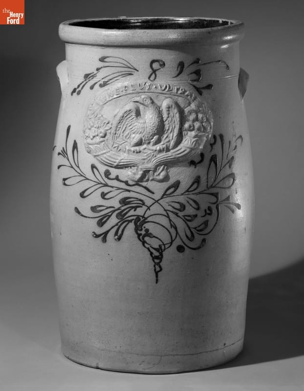 This butter churn was made of a durable, leak-proof pottery called stoneware. The orange-peel-like outer glaze was created when the potter threw handfuls of common rock salt into a white-hot kiln during the piece's firing. Salt-glazed stoneware pieces were decorated with an amazing array of designs, including the eagle and other patriotic motifs molded separately and applied to this piece.