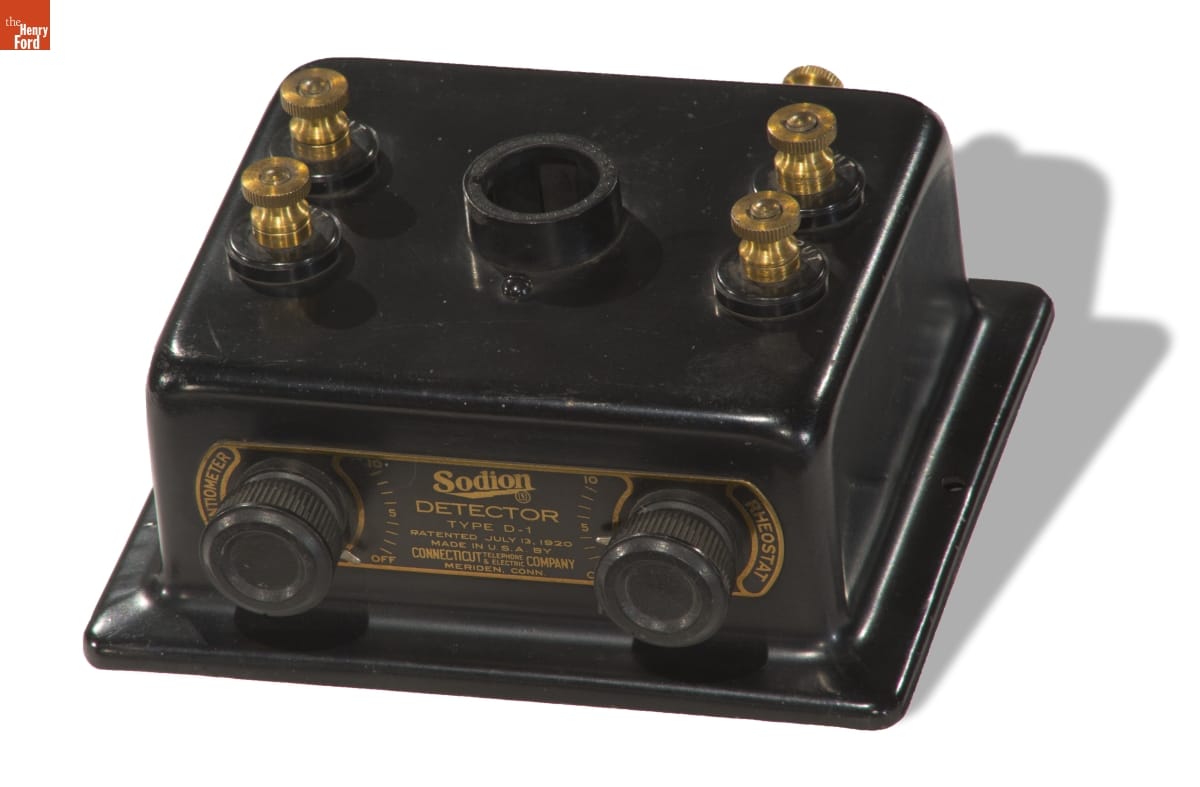 plaque: Sodion Detector Type D-1 Patented July 13, 1920 Made in U.S.A. by Connecticut Telephone & Electric Company Meriden, Conn. dials; Potentiometer Rheostat underside: [schematic]
