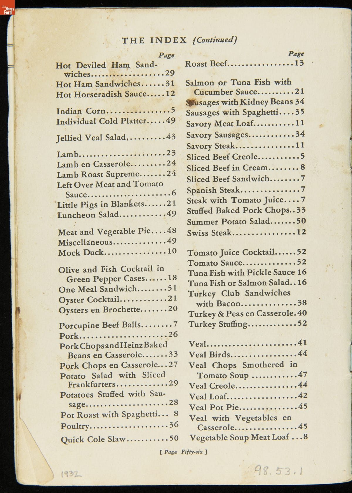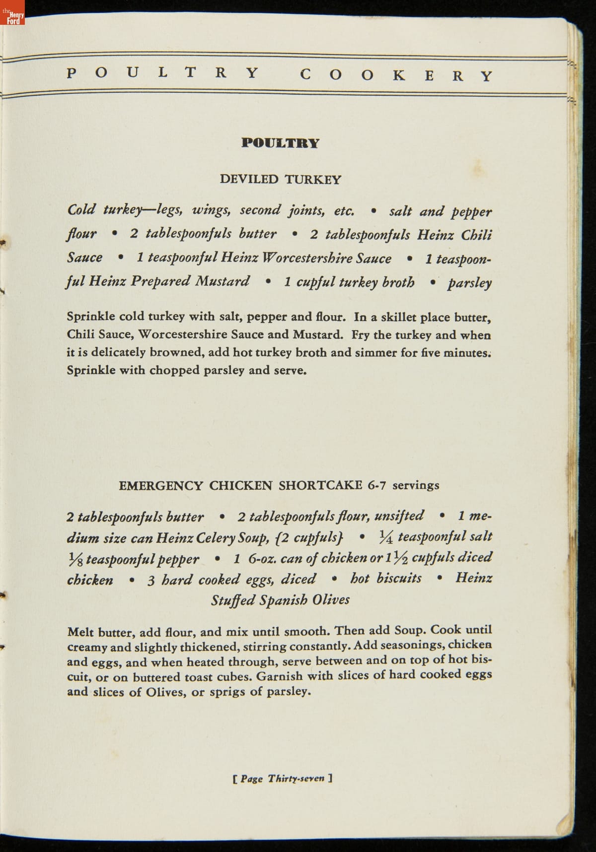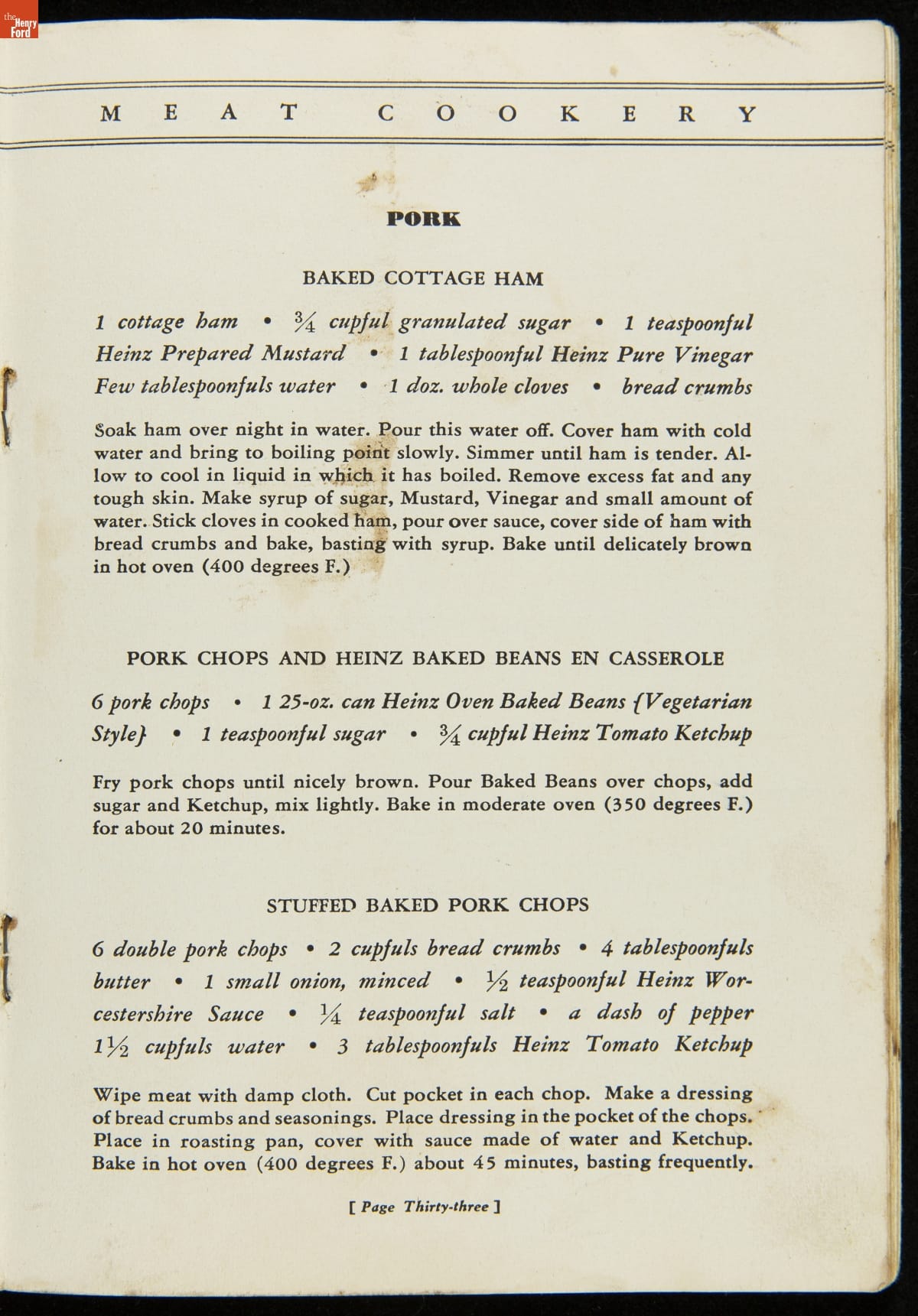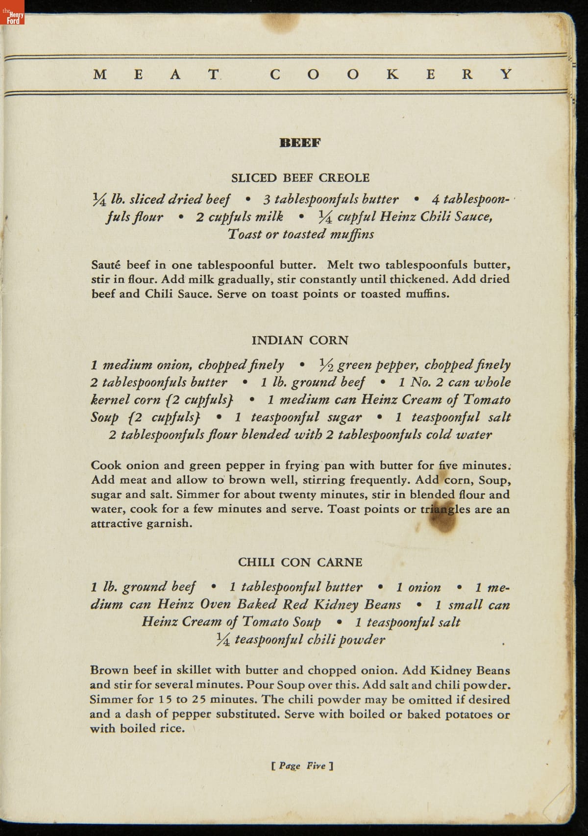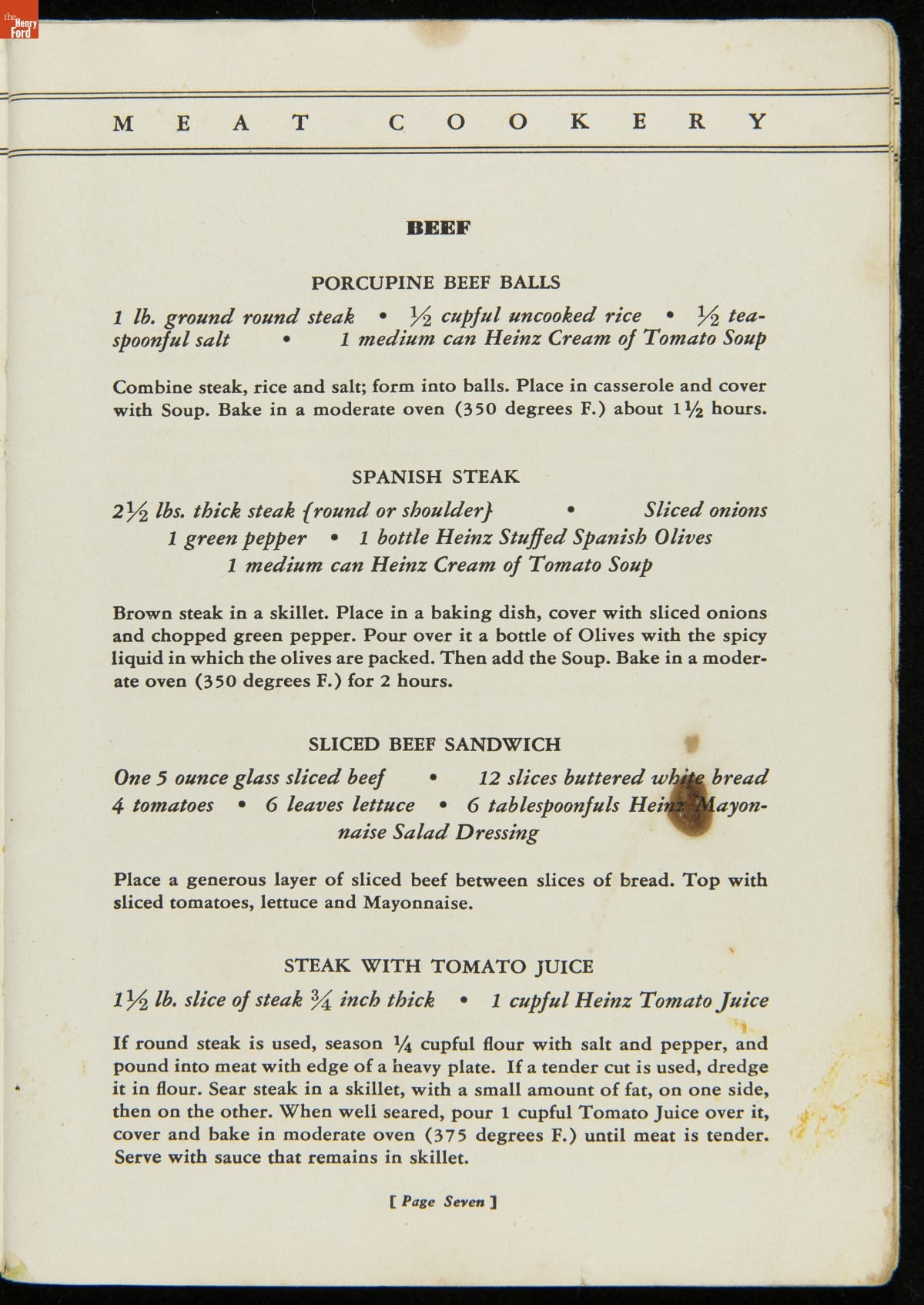 Recipe booklets and cook books can be general or specific in the range and type of food featured within their pages. Like other manufactured food companies, the H.J. Heinz Company published recipe booklets which featured recipes using their products. This recipe booklet from 1932 provides recipes for meat dishes utilizing Heinz products.