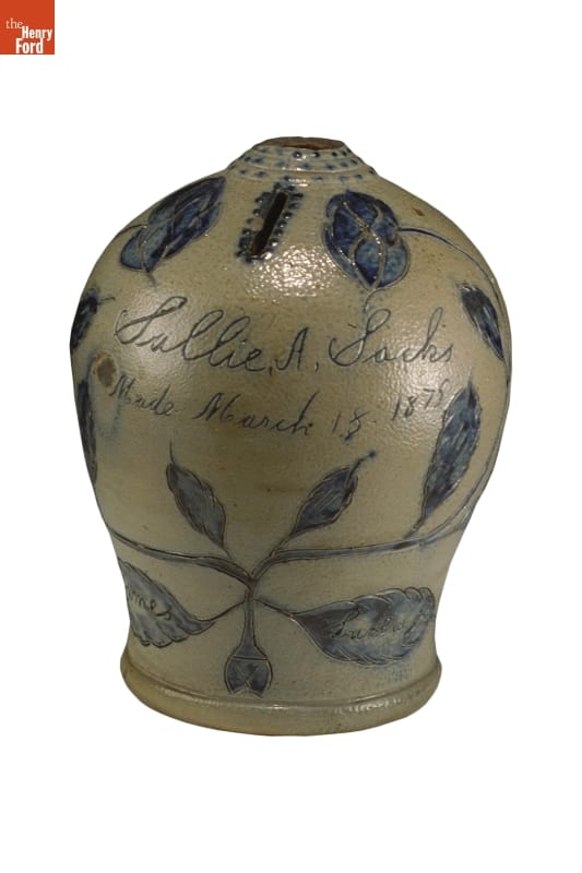 This toy bank was made of a durable, leak-proof pottery called stoneware, shaped on a revolving potter's wheel. The orange-peel-like outer glaze was created when the potter threw handfuls of common rock salt into a white-hot kiln during the piece's firing. Salt-glazed stoneware pieces were decorated with an amazing array of designs, including the leaves and flowers on this piece.