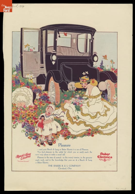 Text reads in part: Pleasure / - and your Rauch & Lang or Baker Electric is a car of Pleasure. / You find pleasure in the utility by which you so easily reach the / out-o'-way places or make a social call. / Pleasure in the ease of control - in the roomy interior, in the genuine / coach work, and in the knowledge that your car is a Rauch & Lang / or Baker Electric.