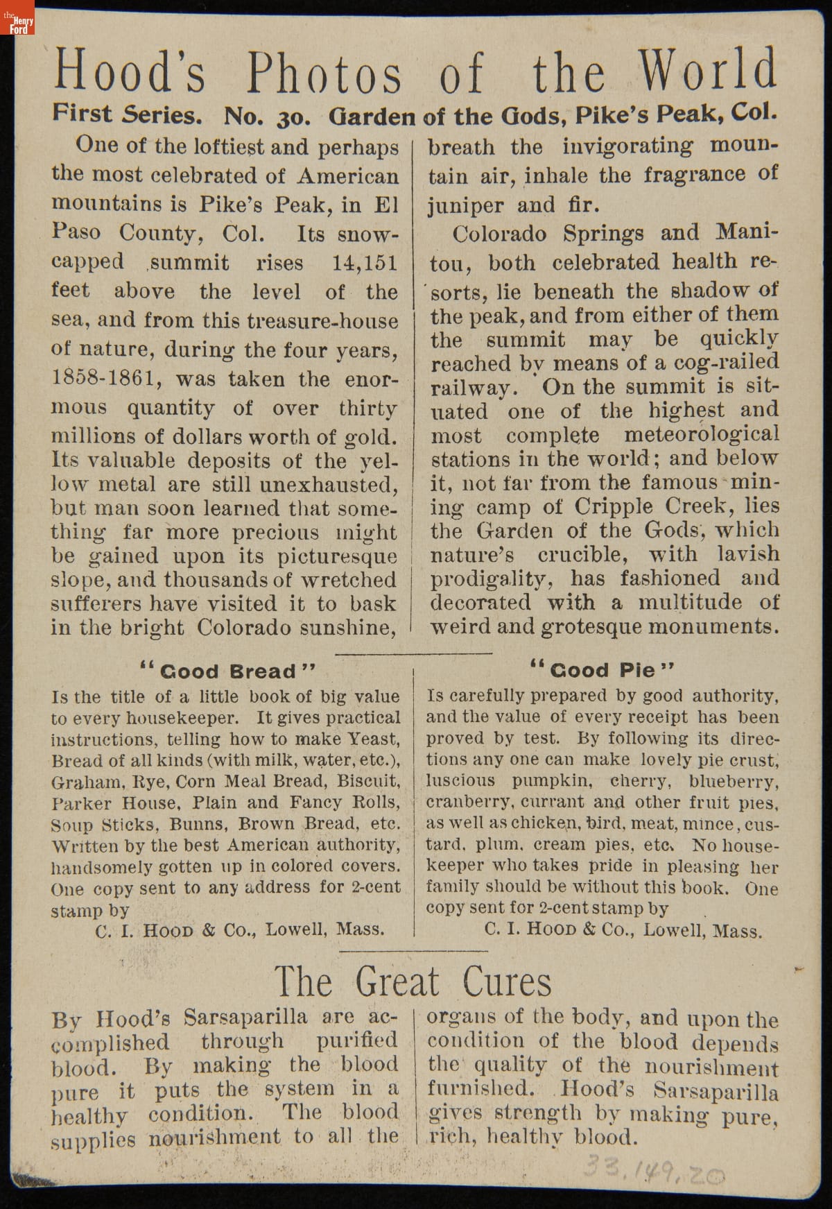 Trade Card for C.I. Hood & Co. with Hood's Photos of the World, "Garden of the Gods, Pike's Peak, Colorado," 1890-1910