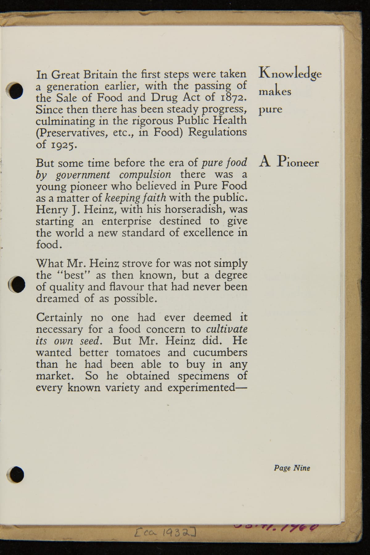 H.J. Heinz built his business from the ground up, skillfully employing his principles and ideals to create one of the most successful companies in the manufactured food industry. This booklet, printed for British audiences, highlights the H.J. Heinz Company's history -- and its history of factories in Great Britain -- with an emphasis on the company's pure and clean practices.
