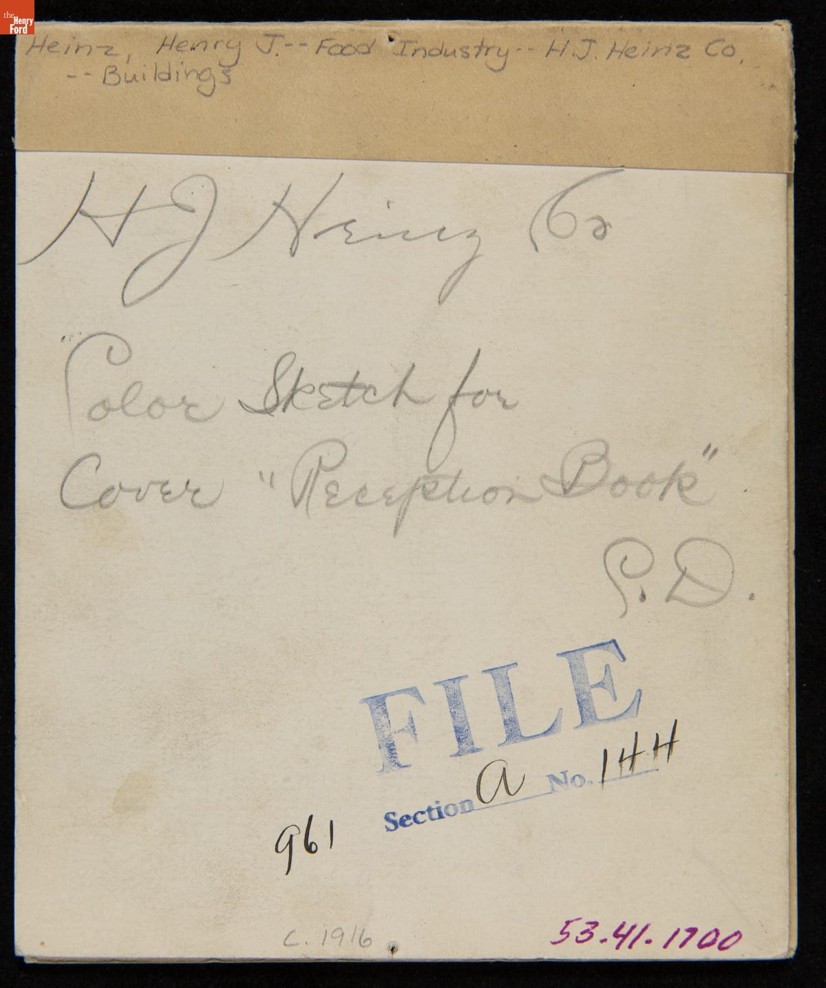 various artists marks, notes, and measurements in margins. written on back: H. J. Heinz Co. / Color Sketch for / cover "Reception Book" / C.D.