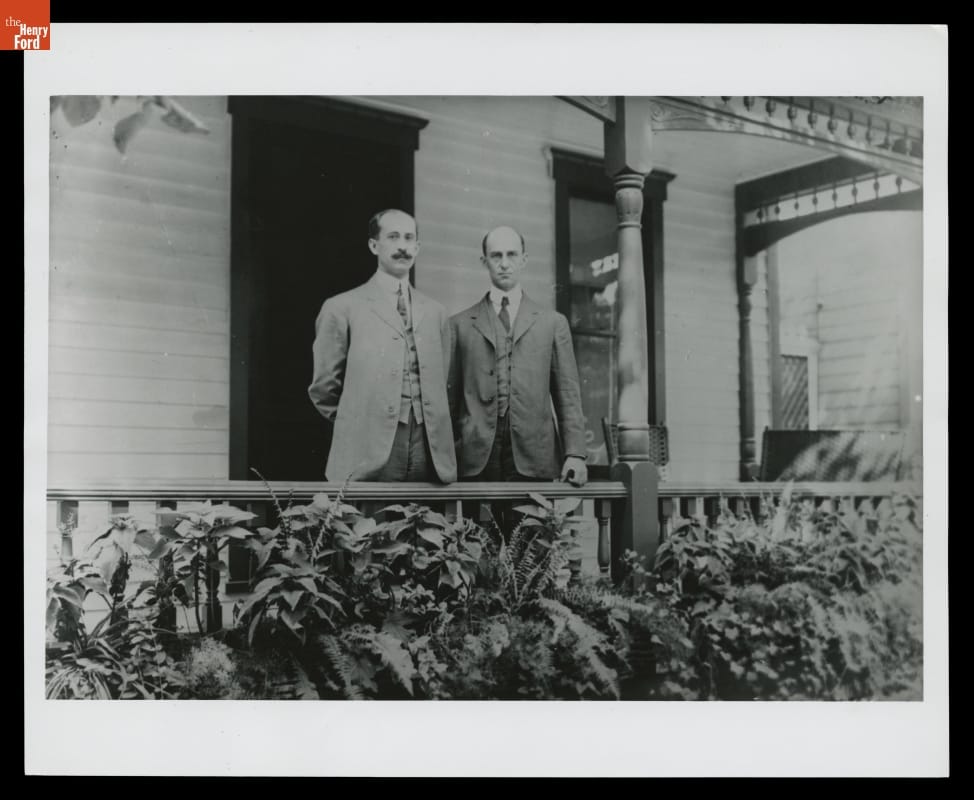 Wilbur and Orville Wright pose on the porch of the Wright family home in Dayton, Ohio. Neither of the brothers married or had children, and both continued to live with their father, Milton, and sister, Katharine. Without families of their own, the Wright brothers were free to devote increasing amounts of time and money to their aviation experiments.