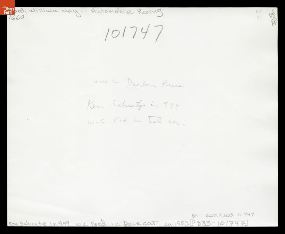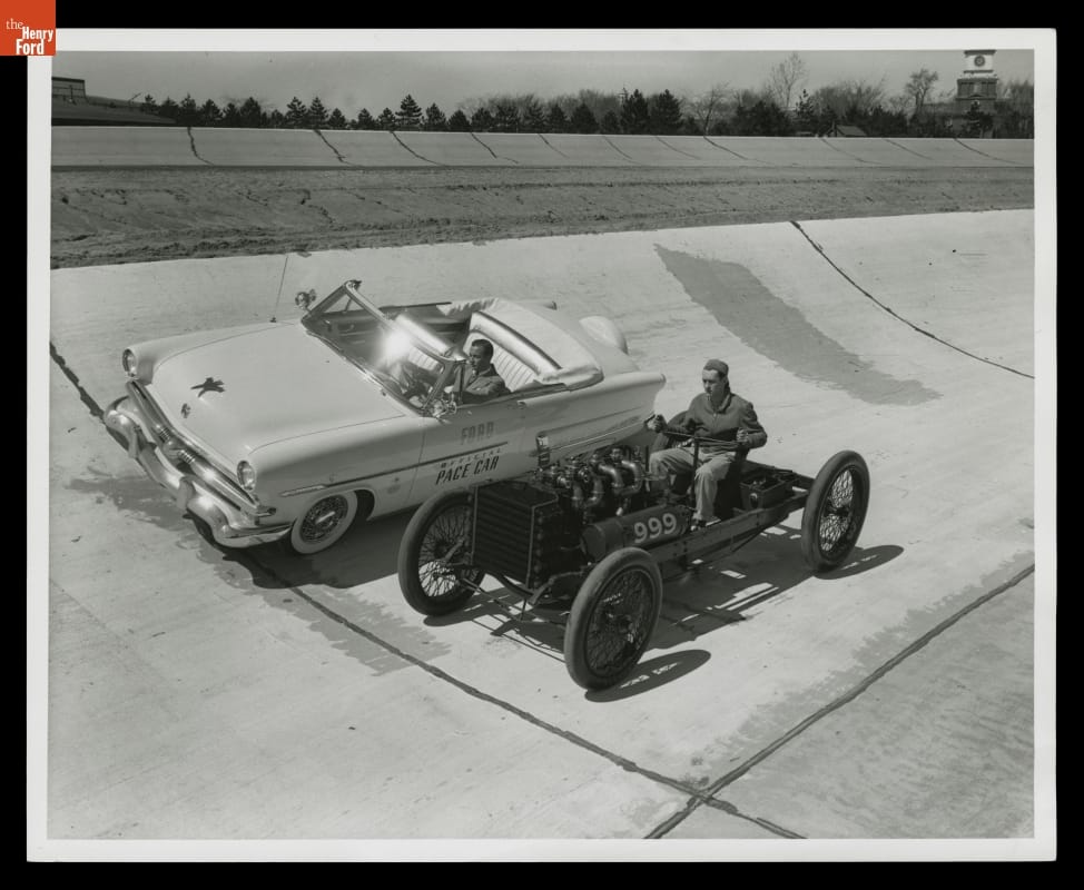 Ford Motor Company celebrated its 50th anniversary in 1953 and was invited to provide the pace car for that year's Indianapolis 500. Six weeks before the race, William Clay Ford and Ken Schuntz posed on the company's Dearborn test track with the pace car, a 1953 Ford Sunliner, and the "999," a race car built by Henry Ford in 1902.