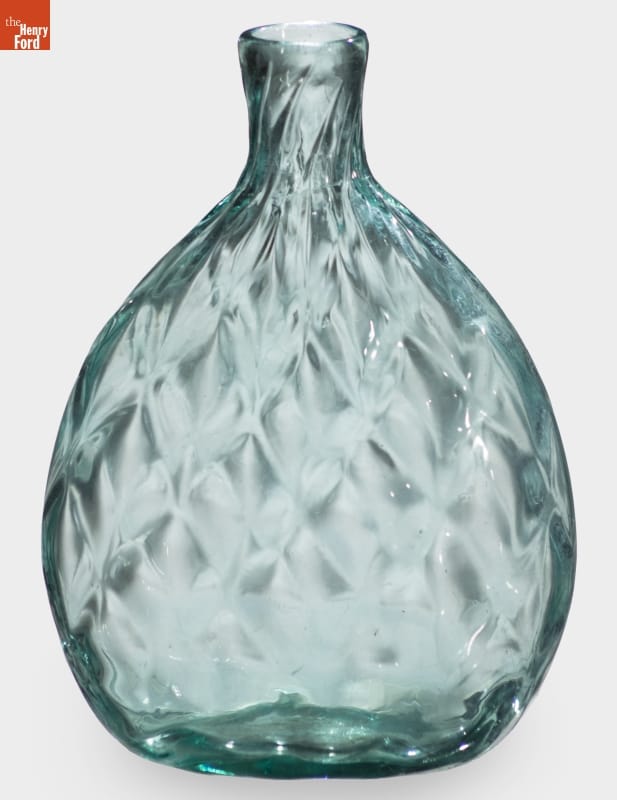 American glass factories produced flasks, like this one, from the late 1700s well into the mid-1800s. The pint-sized flask could hold water but more likely contained alcoholic beverages. Its textured decorative exterior -- formed when the hot glass was dipped into a pattern mold before it was blown -- made the flask easier to grasp. And its flattened shape fit nicely into pockets providing ready access to the liquid refreshment.