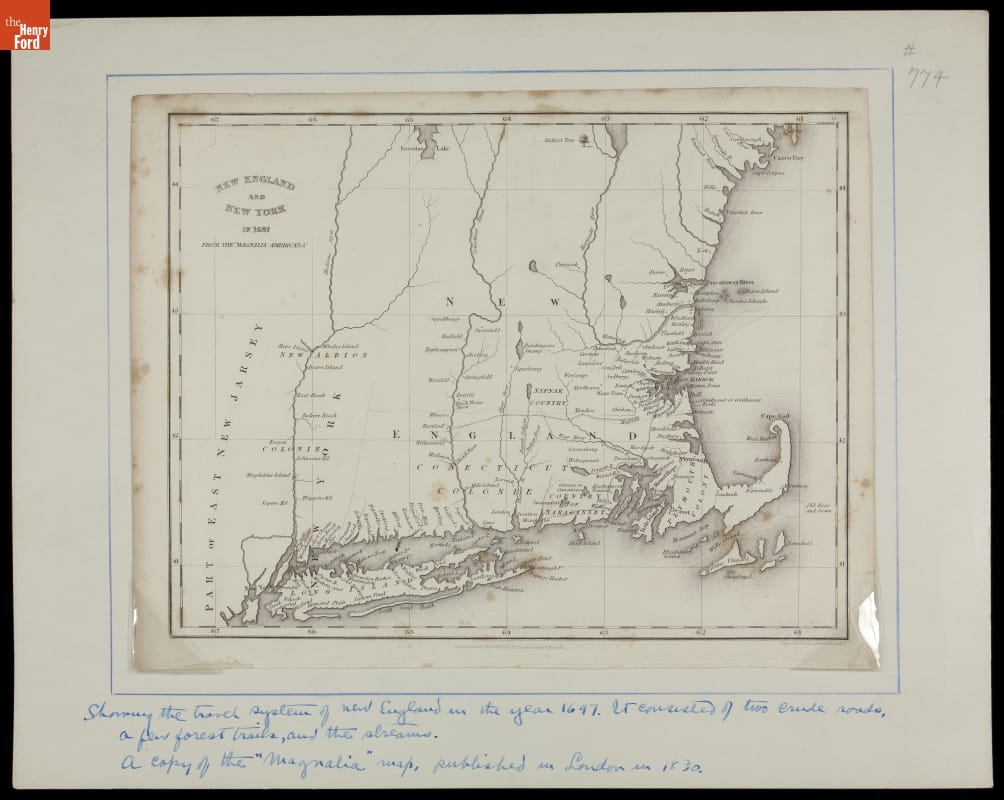 This map, engraved and published in London, England, shows the importance of water routes in the settling of early America. Two crude roads are drawn on the map -- both part of the Boston Post Road, established by the English government in 1673 as a mail-carrying route. This road network later extended to New York State.